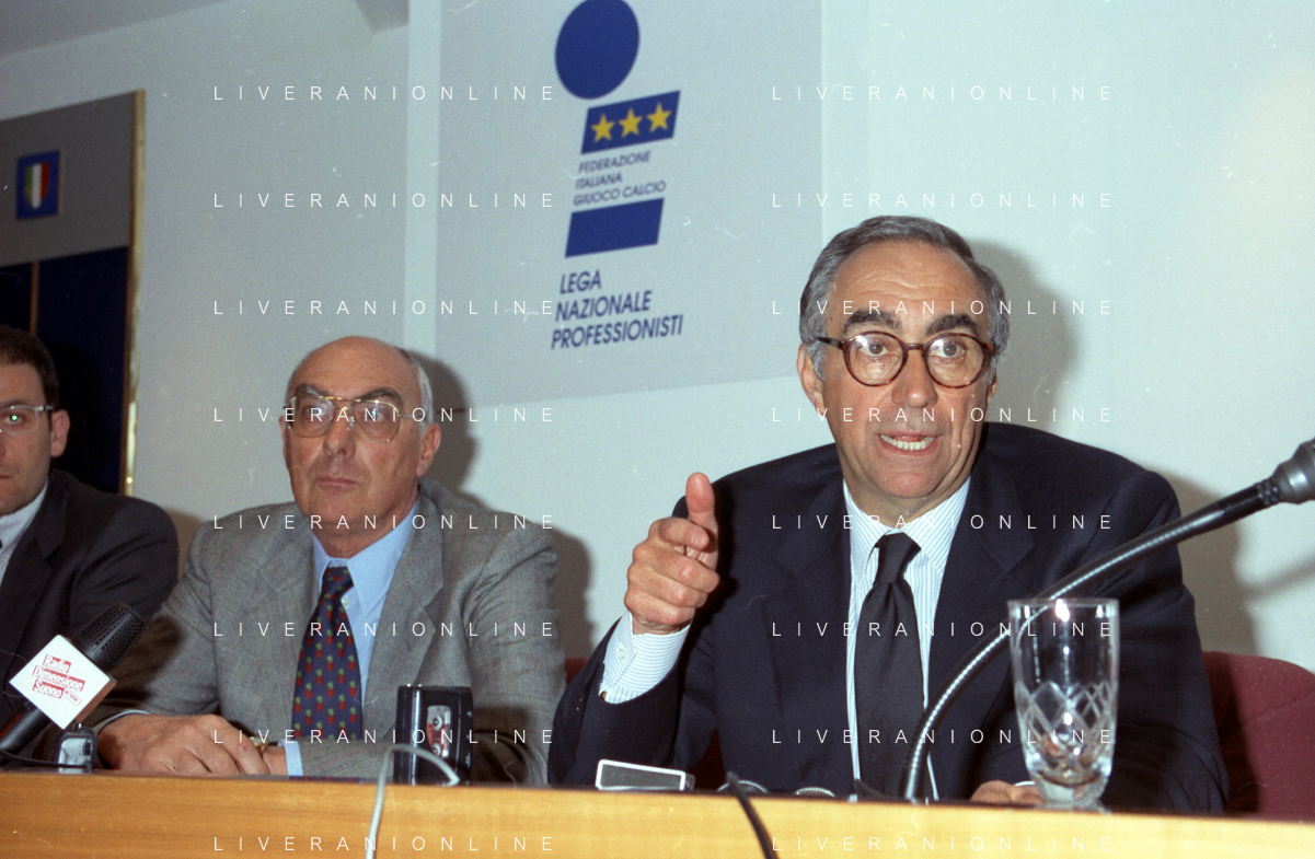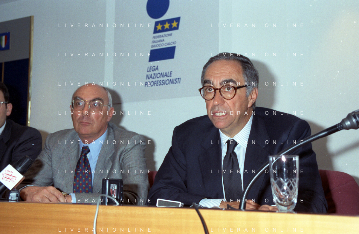 Neg- RETROSPETTIVA FRANCO CARRARO DIRIGENTE SPORTIVO E POLITICO NELLA FOTO FRANCO CARRARO PRESIDENTE FEDERCALCIO CON AZEGLIO VICINI NELL'ANNO 1997-1998 AG ALDO LIVERANI SAS
