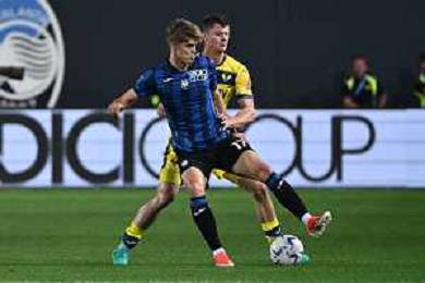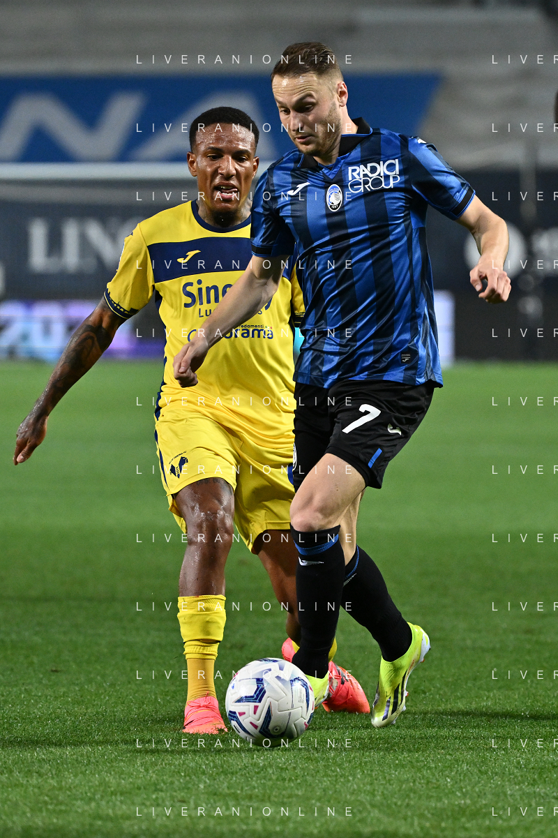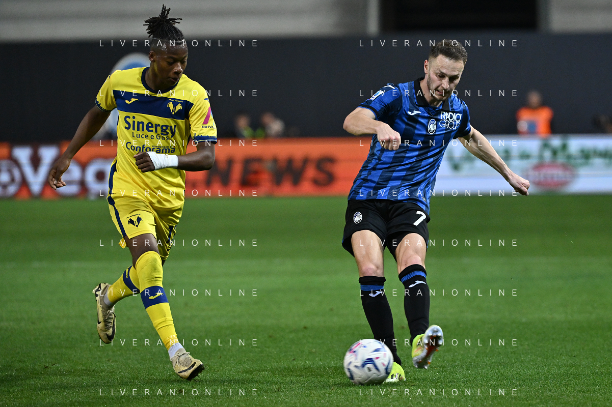 TVRG Atalanta vs Hellas Verona nella foto Michael Folorunsho (Hellas Verona) e Teun Koopmeiners (Atalanta) Bergamo 15-04-2024 Gewiss Stadium Campionato Serie A TIM - 32a giornata foto Roberto Garavaglia/Agenzia Aldo Liverani sas/ AGENZIA ALDO LIVERANI SAS