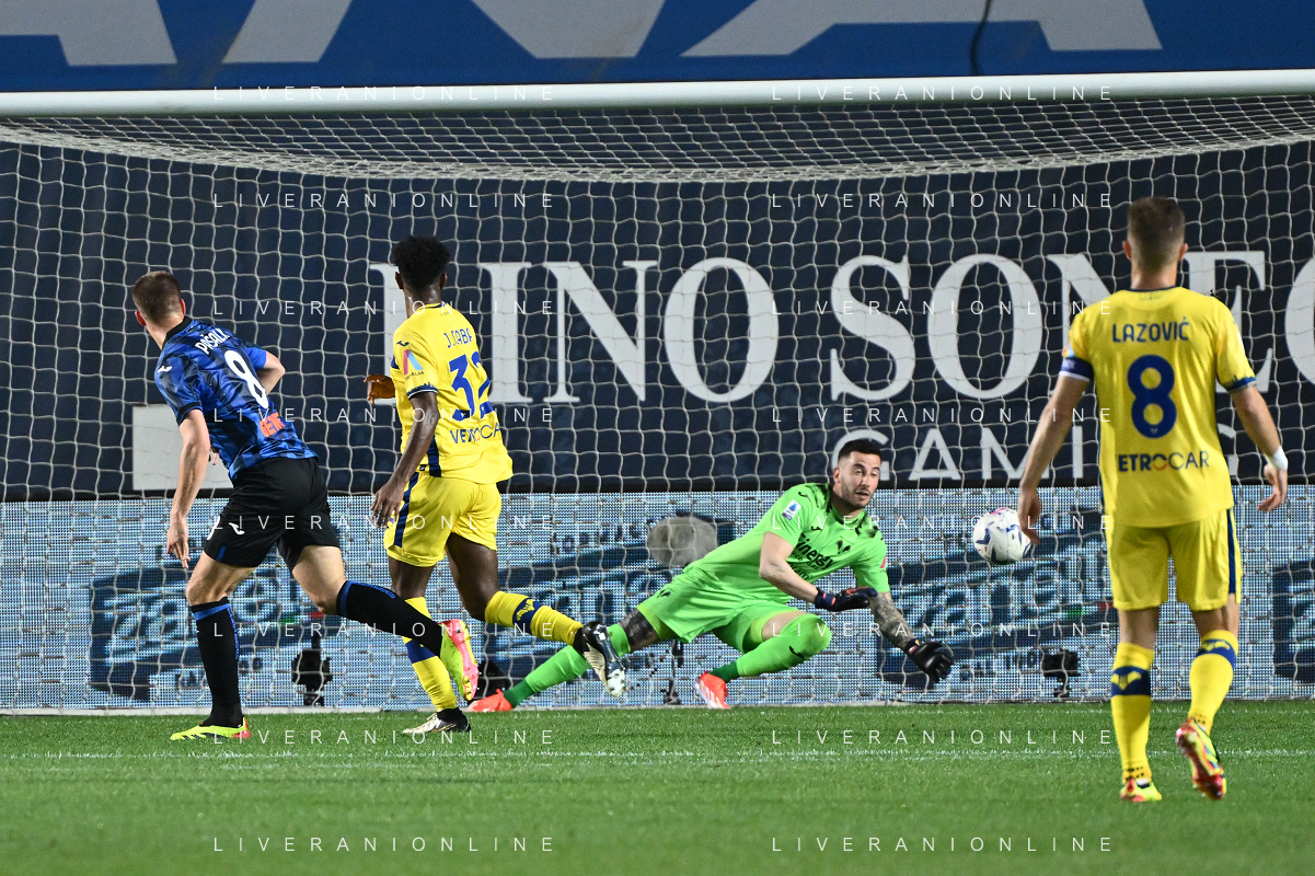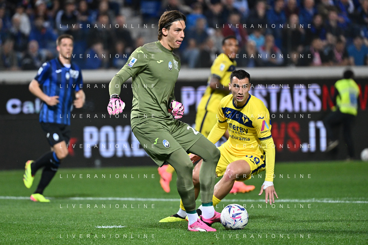 TVRG Atalanta vs Hellas Verona nella foto Marco Carnesecchi (Atalanta) e Federico Bonazzoli (Hellas Verona) Bergamo 15-04-2024 Gewiss Stadium Campionato Serie A TIM - 32a giornata foto Roberto Garavaglia/Agenzia Aldo Liverani sas/ AGENZIA ALDO LIVERANI SAS