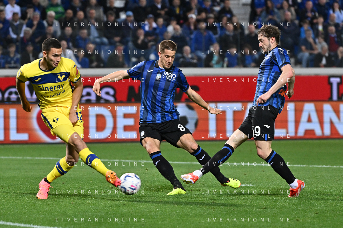 TVRG Atalanta vs Hellas Verona nella foto Mario Pasalic (Atalanta) e Fabien Centonze (Hellas Verona) Bergamo 15-04-2024 Gewiss Stadium Campionato Serie A TIM - 32a giornata foto Roberto Garavaglia/Agenzia Aldo Liverani sas/ AGENZIA ALDO LIVERANI SAS