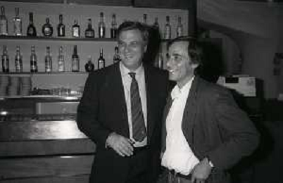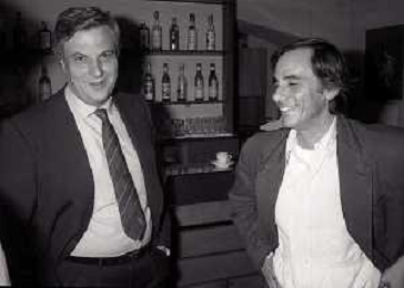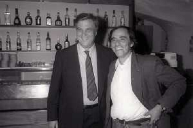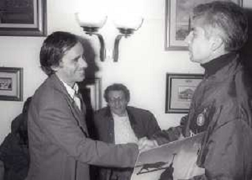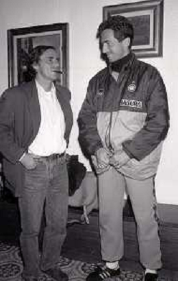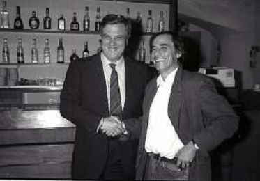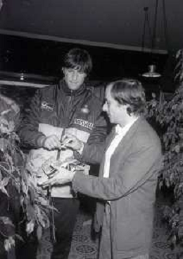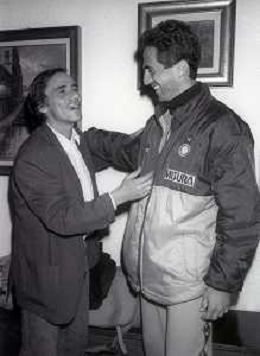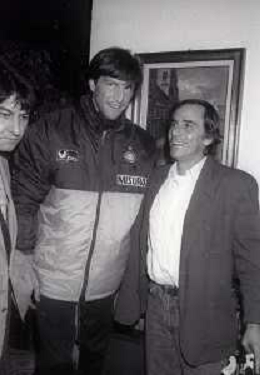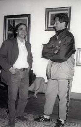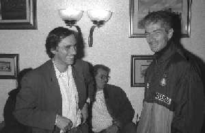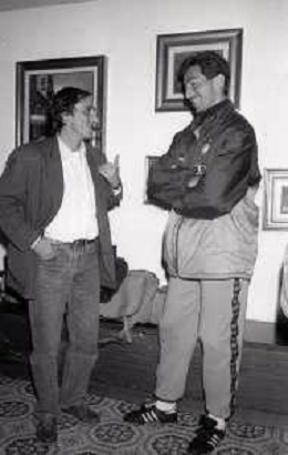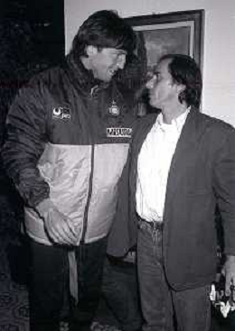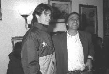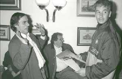 NEG-RETROSPETTIVA ROBERTO VECCHIONI CANTANTE NELLA FOTO ROBERTO VECCHIONI CON PAOLO STRINGARA NELL'ANNO 1990-1991 AD APPIANO GENTILE IN VISITA AL RITIRO INTER AG ALDO LIVERANI SAS