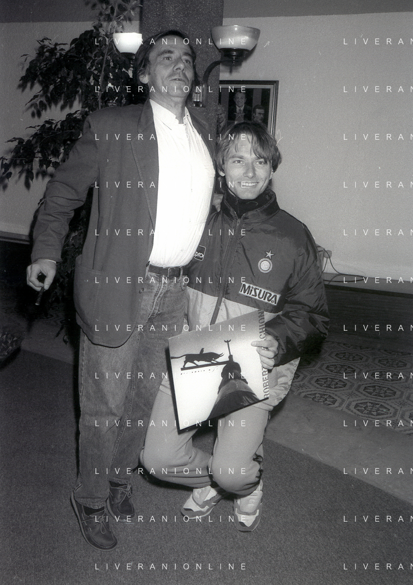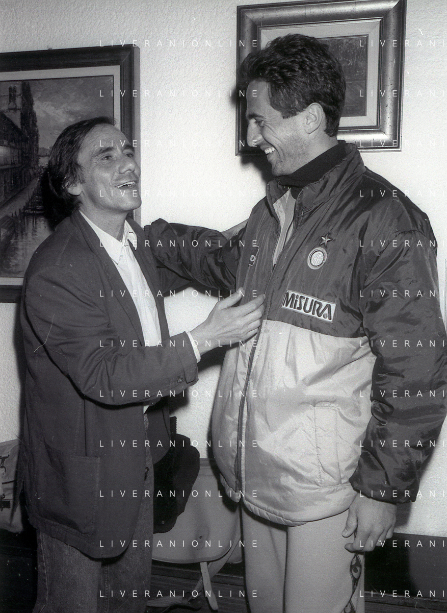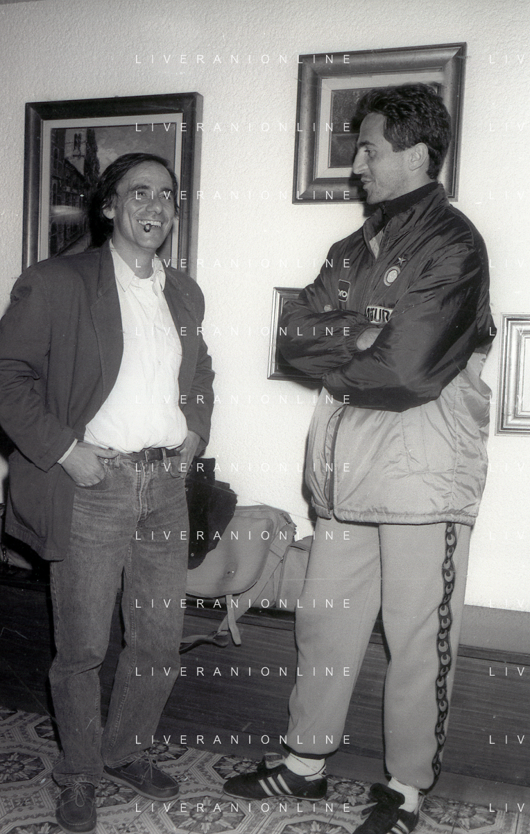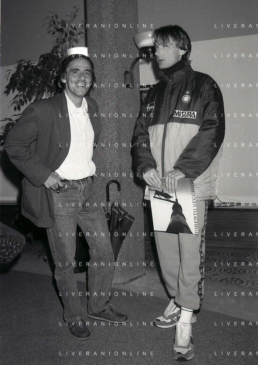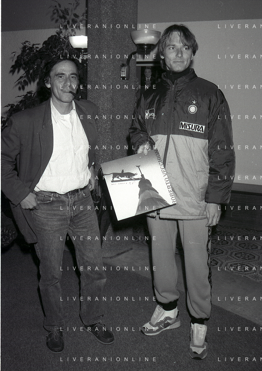 NEG-RETROSPETTIVA ROBERTO VECCHIONI CANTANTE NELLA FOTO ROBERTO VECCHIONI CON RICCARDO FERRI NELL'ANNO 1990-1991 AD APPIANO GENTILE IN VISITA AL RITIRO INTER AG ALDO LIVERANI SAS