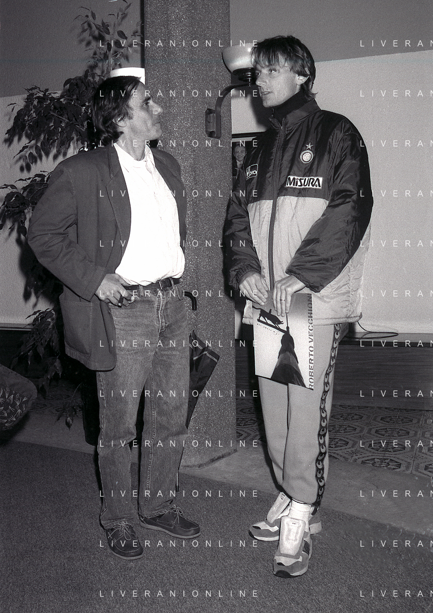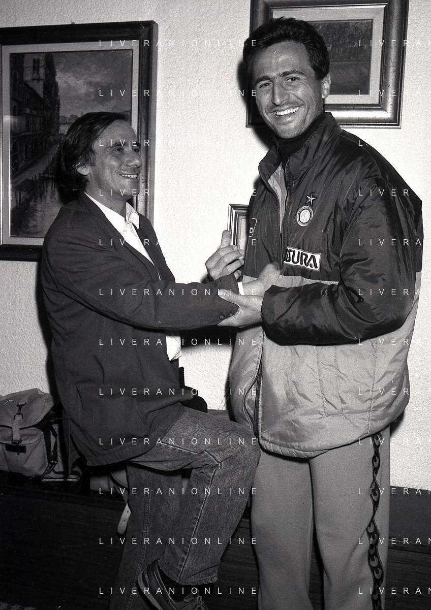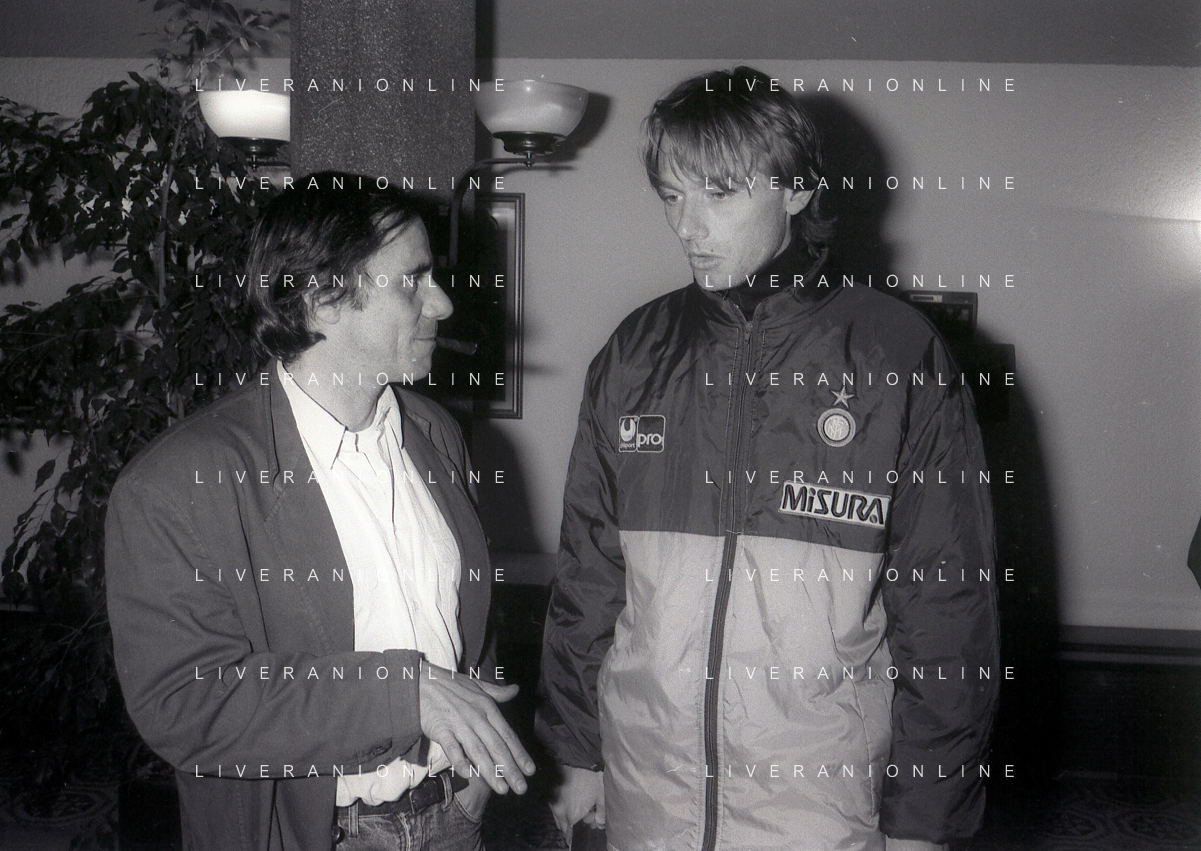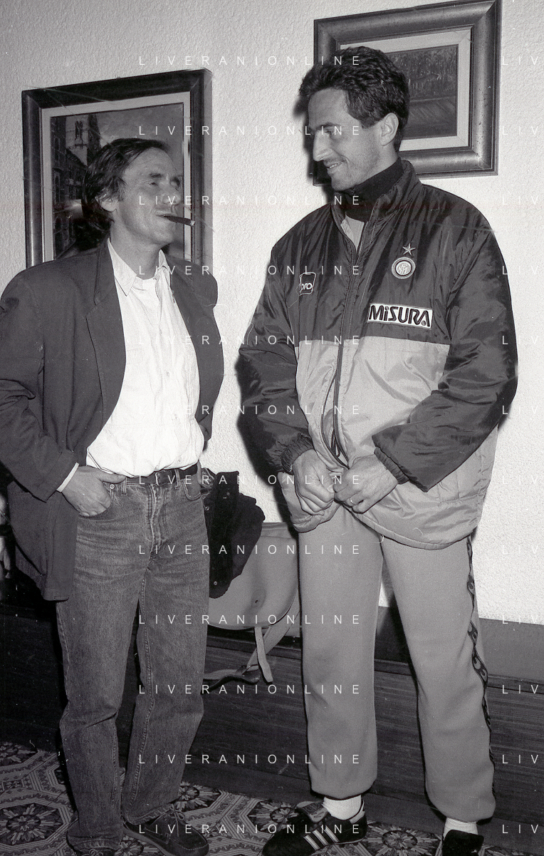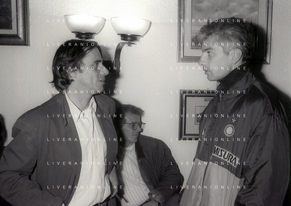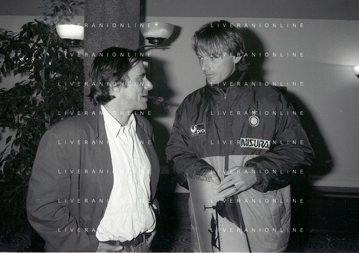 NEG-RETROSPETTIVA ROBERTO VECCHIONI CANTANTE NELLA FOTO ROBERTO VECCHIONI CON RICCARDO FERRI NELL'ANNO 1990-1991 AD APPIANO GENTILE IN VISITA AL RITIRO INTER AG ALDO LIVERANI SAS