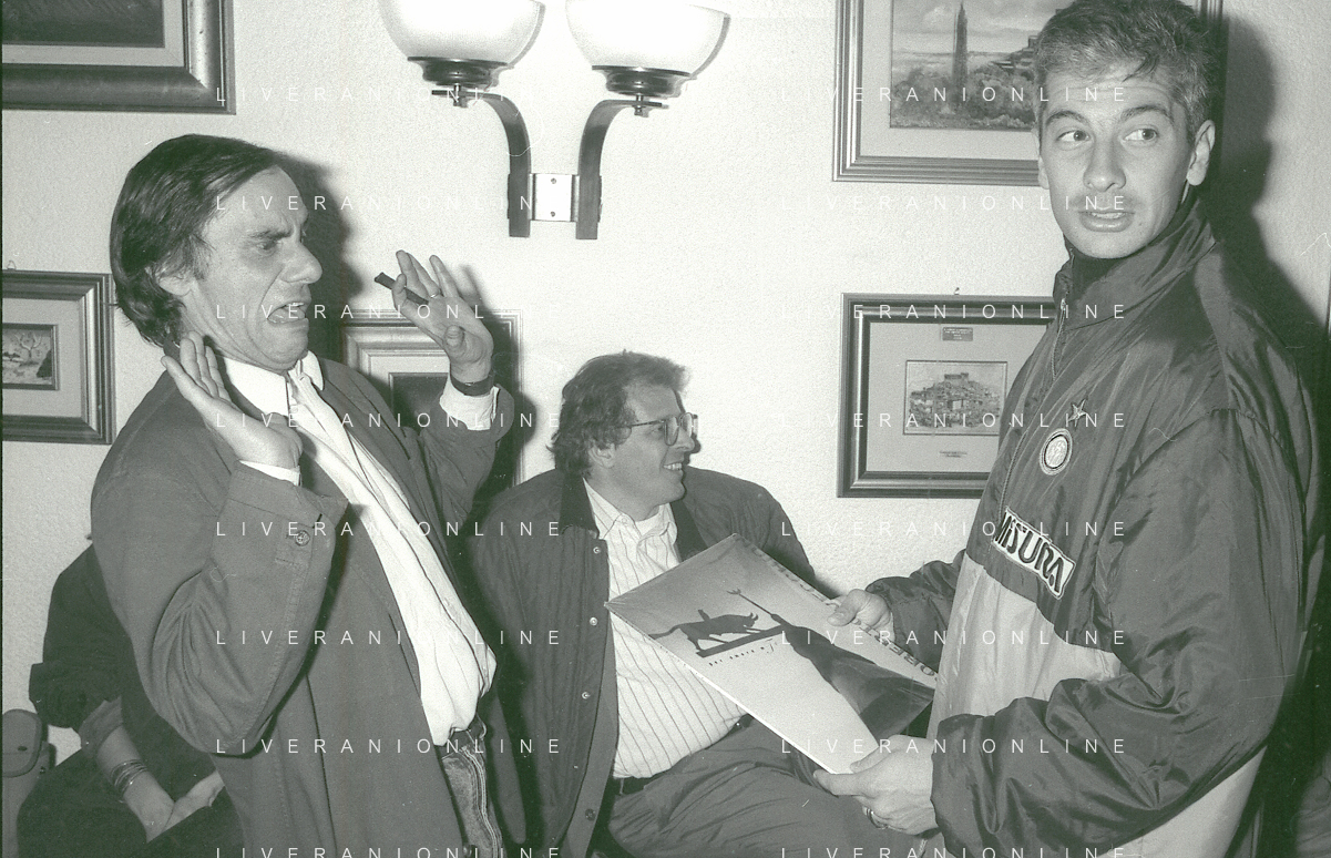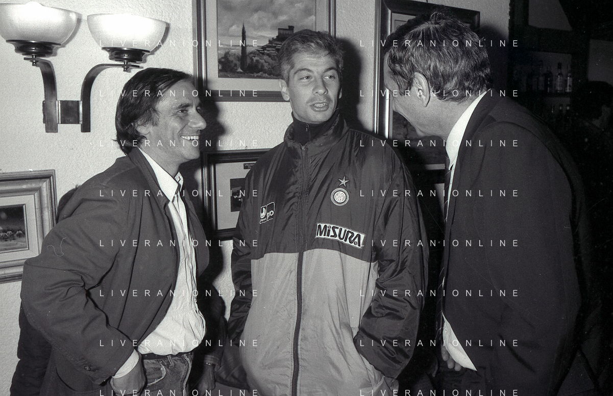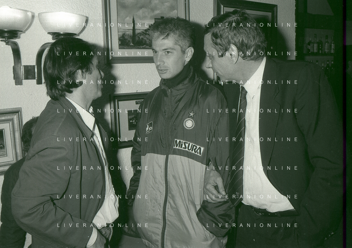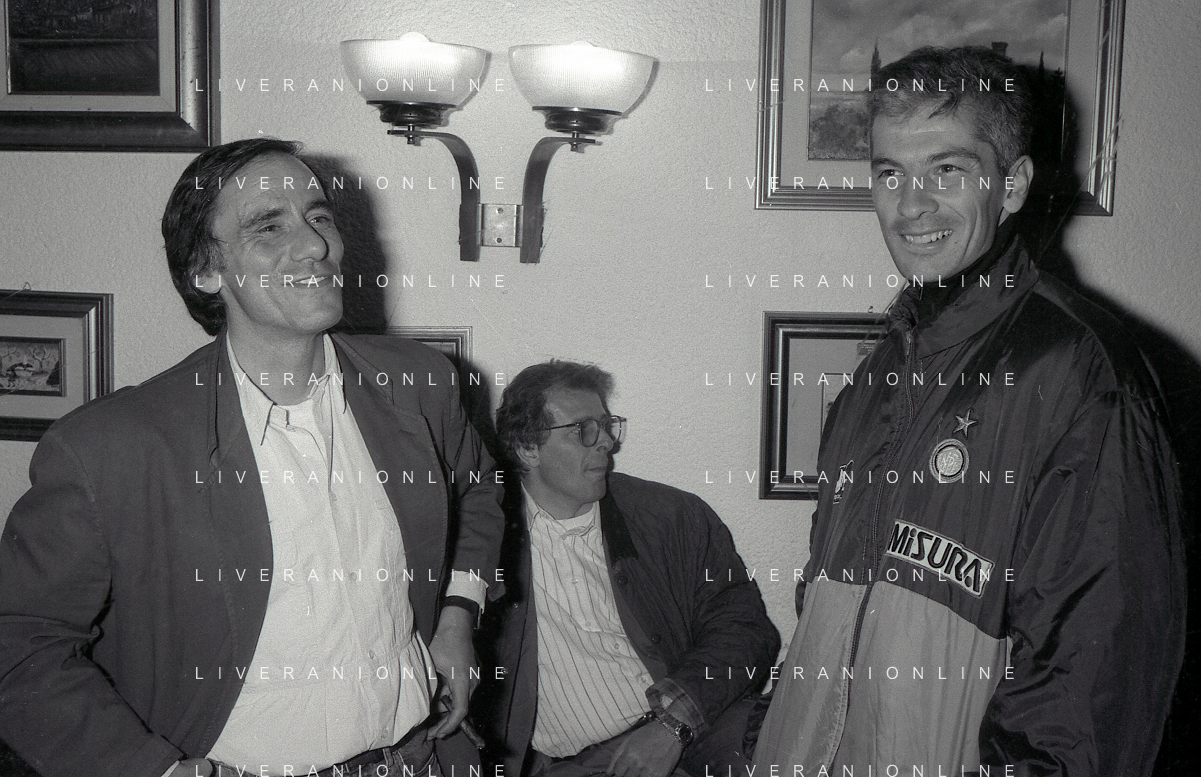 NEG-RETROSPETTIVA ROBERTO VECCHIONI CANTANTE NELLA FOTO ROBERTO VECCHIONI CON PAOLO STRINGARA E VALBERTO MILIANI NELL'ANNO 1990-1991 AD APPIANO GENTILE IN VISITA AL RITIRO INTER AG ALDO LIVERANI SAS