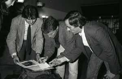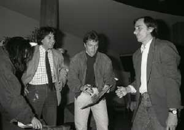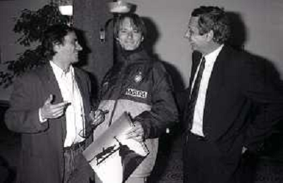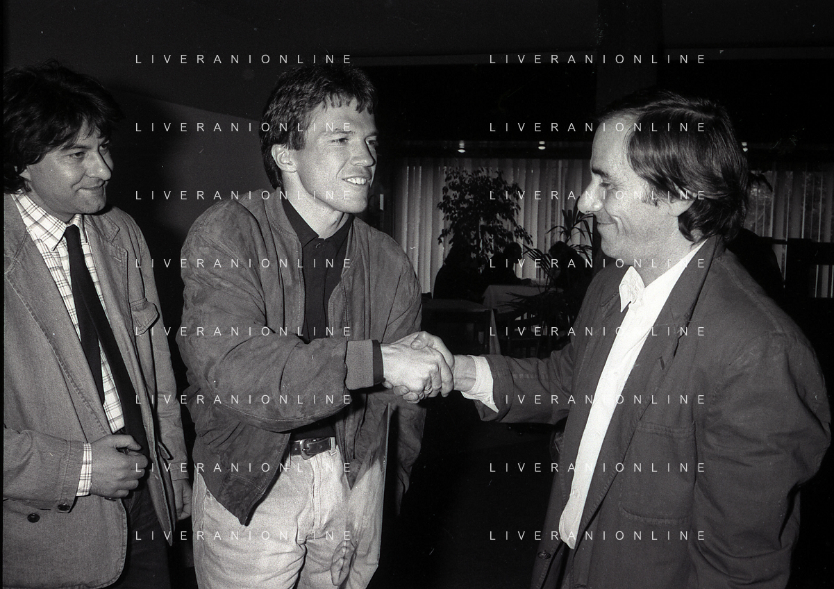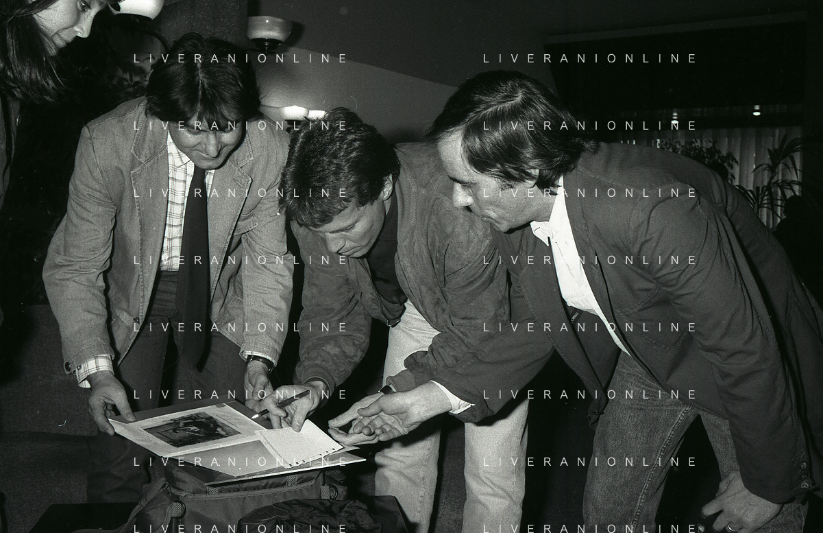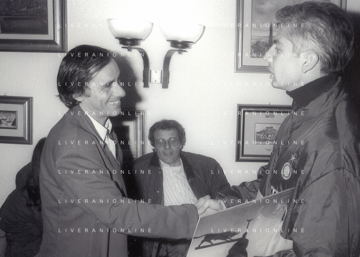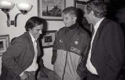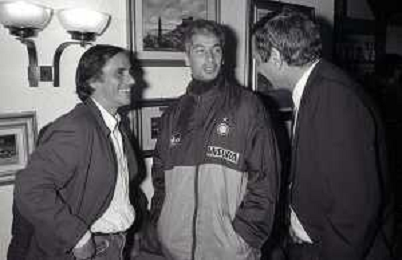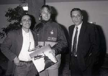 NEG-RETROSPETTIVA ROBERTO VECCHIONI CANTANTE NELLA FOTO ROBERTO VECCHIONI CON PAOLO STRINGARA E VALBERTO MILIANI NELL'ANNO 1990-1991 AD APPIANO GENTILE IN VISITA AL RITIRO INTER AG ALDO LIVERANI SAS