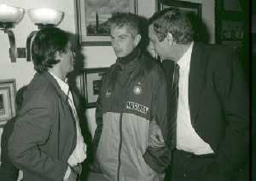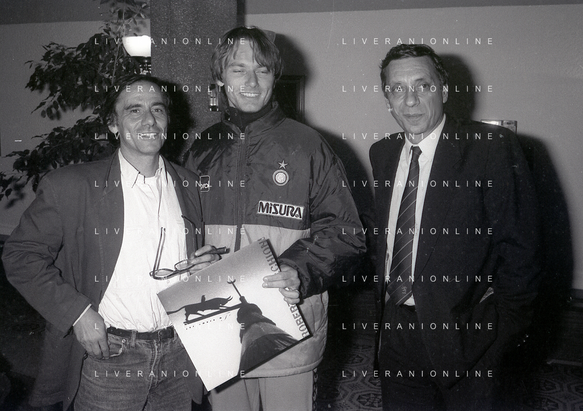 NEG-RETROSPETTIVA ROBERTO VECCHIONI CANTANTE NELLA FOTO ROBERTO VECCHIONI CON DAVIDE FONTOLAN E VALBERTO MILIANI NELL'ANNO 1990-1991 AD APPIANO GENTILE IN VISITA AL RITIRO INTER AG ALDO LIVERANI SAS