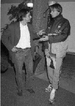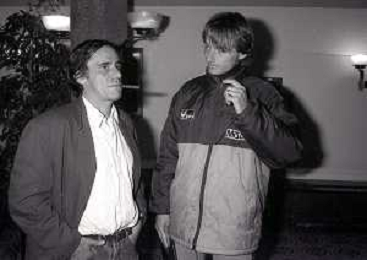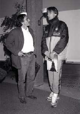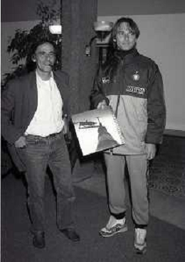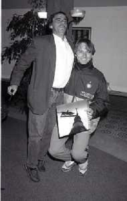 NEG-RETROSPETTIVA ROBERTO VECCHIONI CANTANTE NELLA FOTO ROBERTO VECCHIONI CON ALESSANDRO BIANCHI NELL'ANNO 1990-1991 AD APPIANO GENTILE IN VISITA AL RITIRO INTER AG ALDO LIVERANI SAS