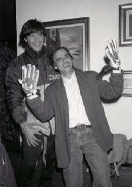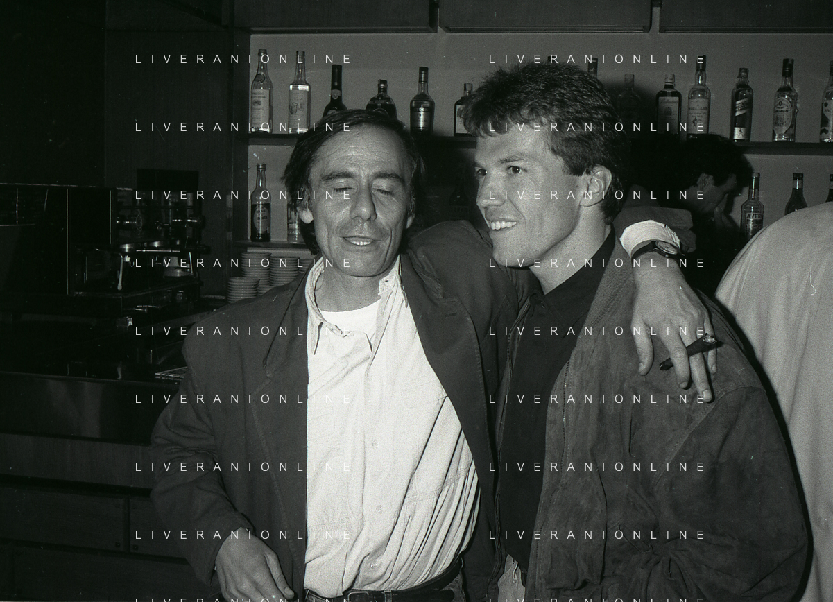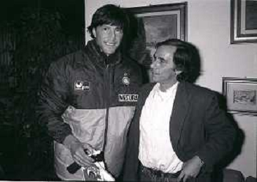 NEG-RETROSPETTIVA ROBERTO VECCHIONI CANTANTE NELLA FOTO ROBERTO VECCHIONI CON LOTHAR MATTHAUS NELL'ANNO 1990-1991 AD APPIANO GENTILE IN VISITA AL RITIRO INTER AG ALDO LIVERANI SAS