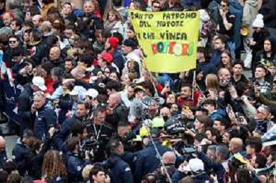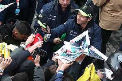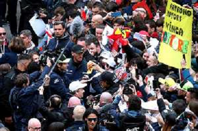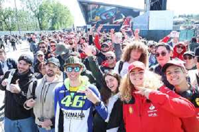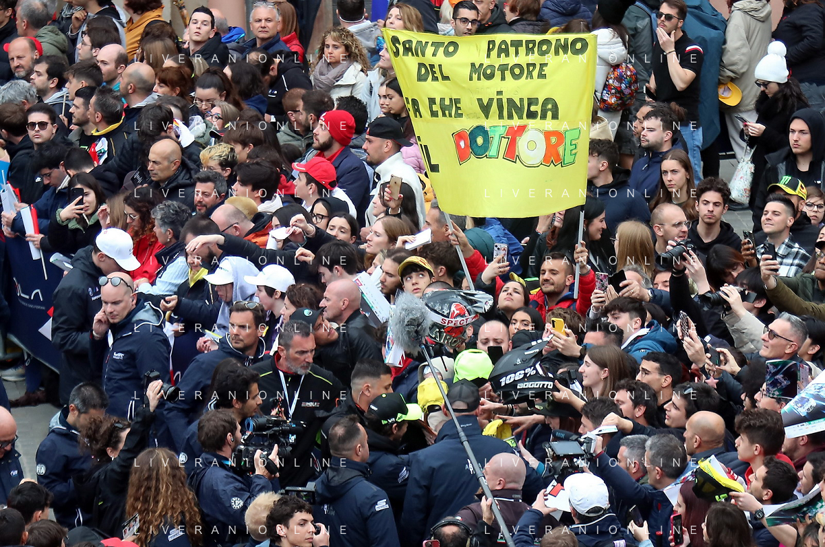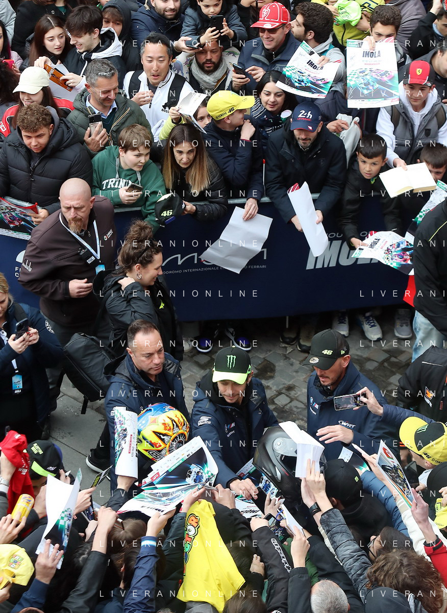 IMOLA 18 04 2024 WEC 6 ORE DI IMOLA PILOTI IN PIAZZA MATTEOTI CON I TIFOSI NELLA FOTO VALENTINO ROSSI BMW M4 LMGT3 CON I TIFOSI FOTO GIANNI SANNA-AG ALDO LIVERANI SAS