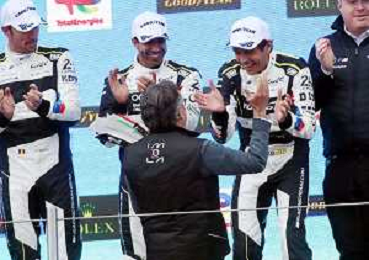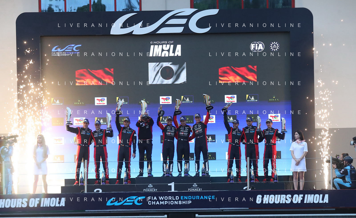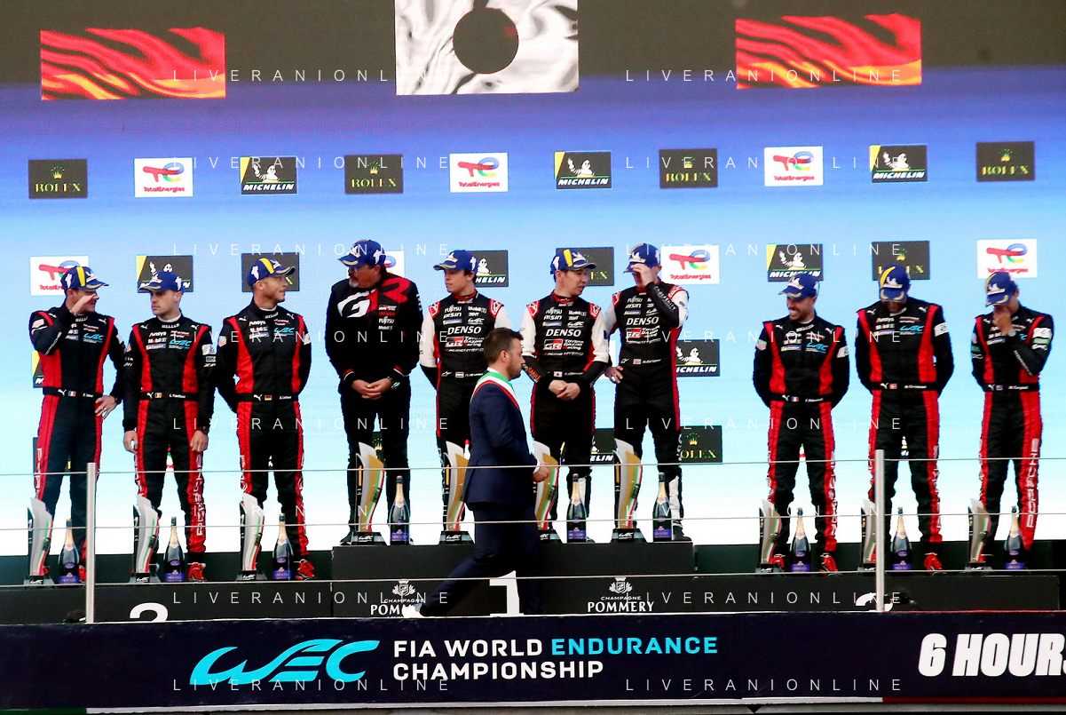 IMOLA 21 04 2024 AUTODROMO ENZO E DINO FERRARI WEC 6 ORE DI IMOLA NELLA FOTO SINDACO MARCO PANIERI PREMIA I VINCITORI DELLA GARA 6 ORE DI IMOLA TOYOTA MIKE CONWAY KAMUI KOBAYASHI E NYCK DE VRIES foto gianni sanna-ag aldo liverani sas