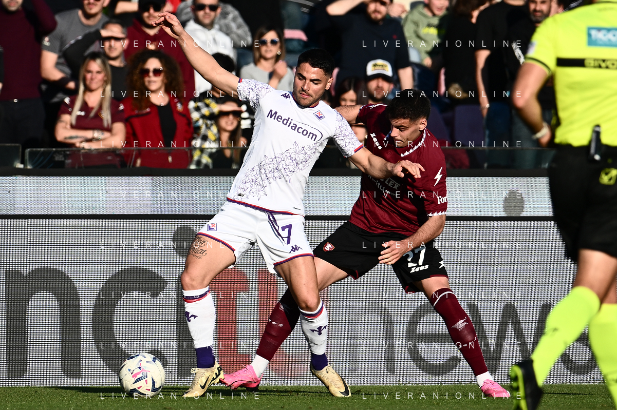 Salernitana vs Fiorentina - Campionato di calcio Serie A 2023/2024 - Stadio Arechi. Nella foto: Riccardo Sottil e Niccolò Pierozzi FOTO ANDREA ROSITO-AG ALDO LIVERANI SAS