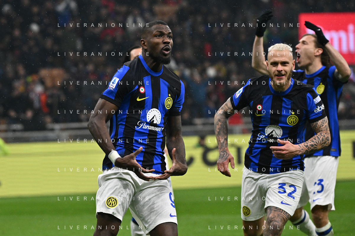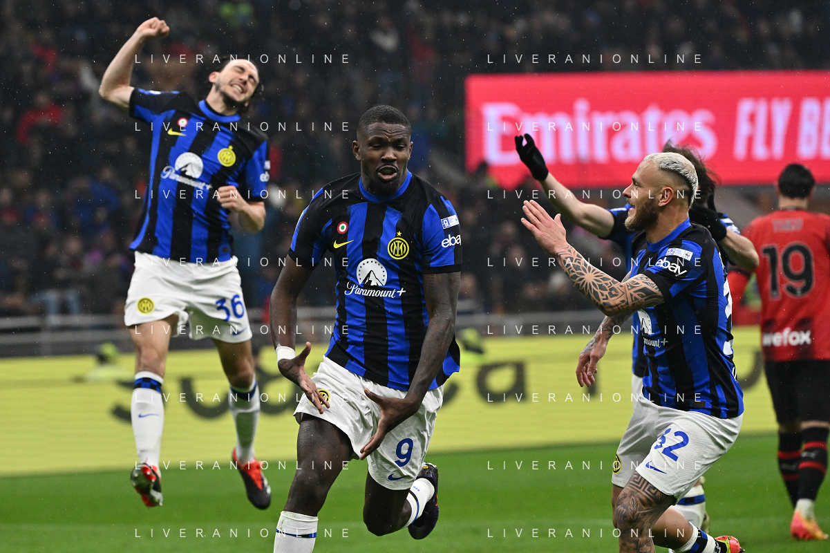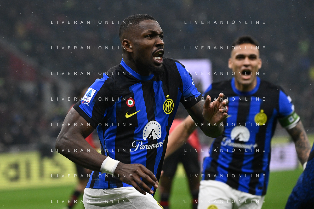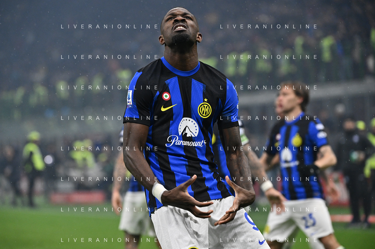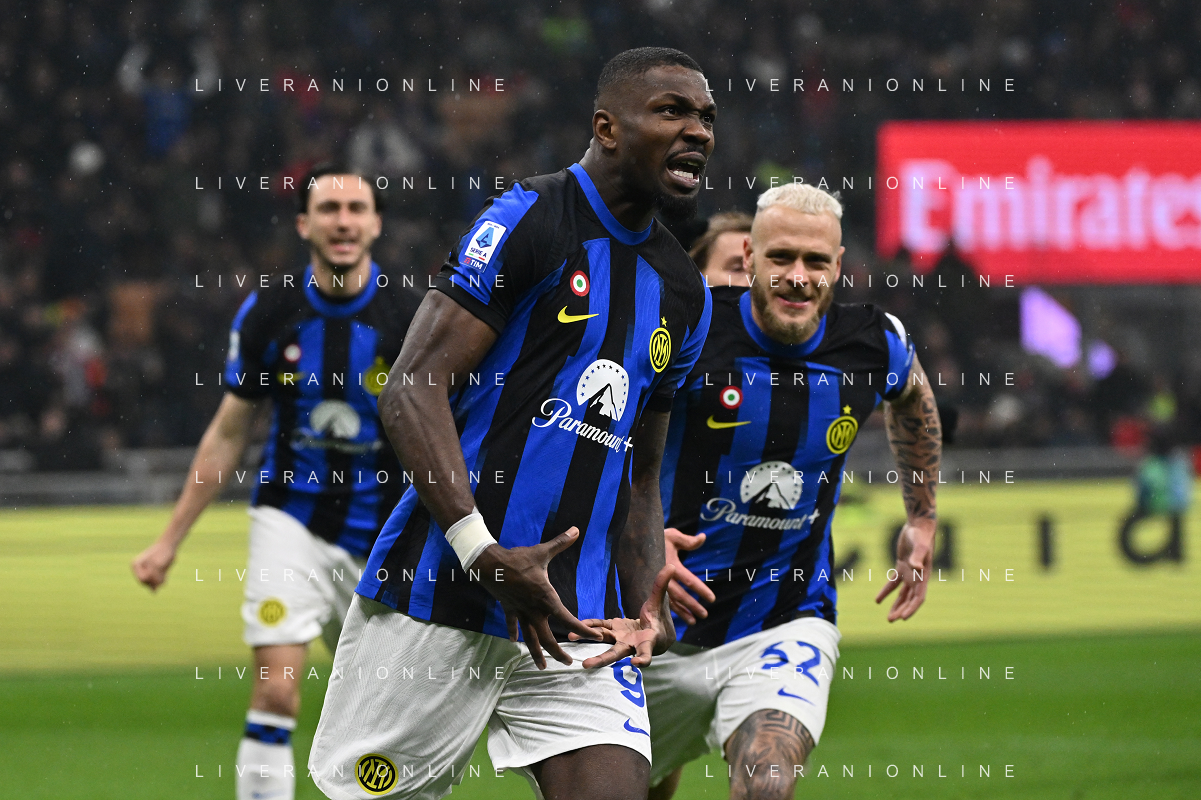 Milan vs Inter nella foto Marcus Thuram (Inter) esulta dopo il gol del 2 a 0 Milano 22-04-2024 Stadio Giuseppe Meazza - San Siro Campionato Serie A TIM - 33a giornata foto Roberto Garavaglia/Agenzia Aldo Liverani sas / AGENZIA ALDO LIVERANI SAS