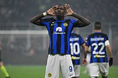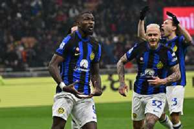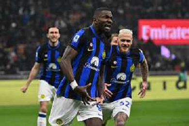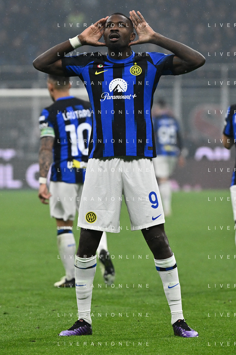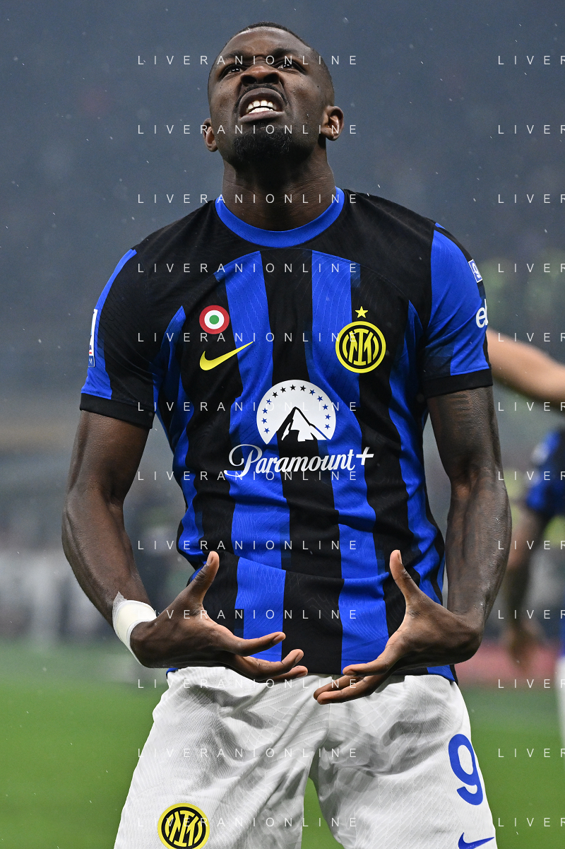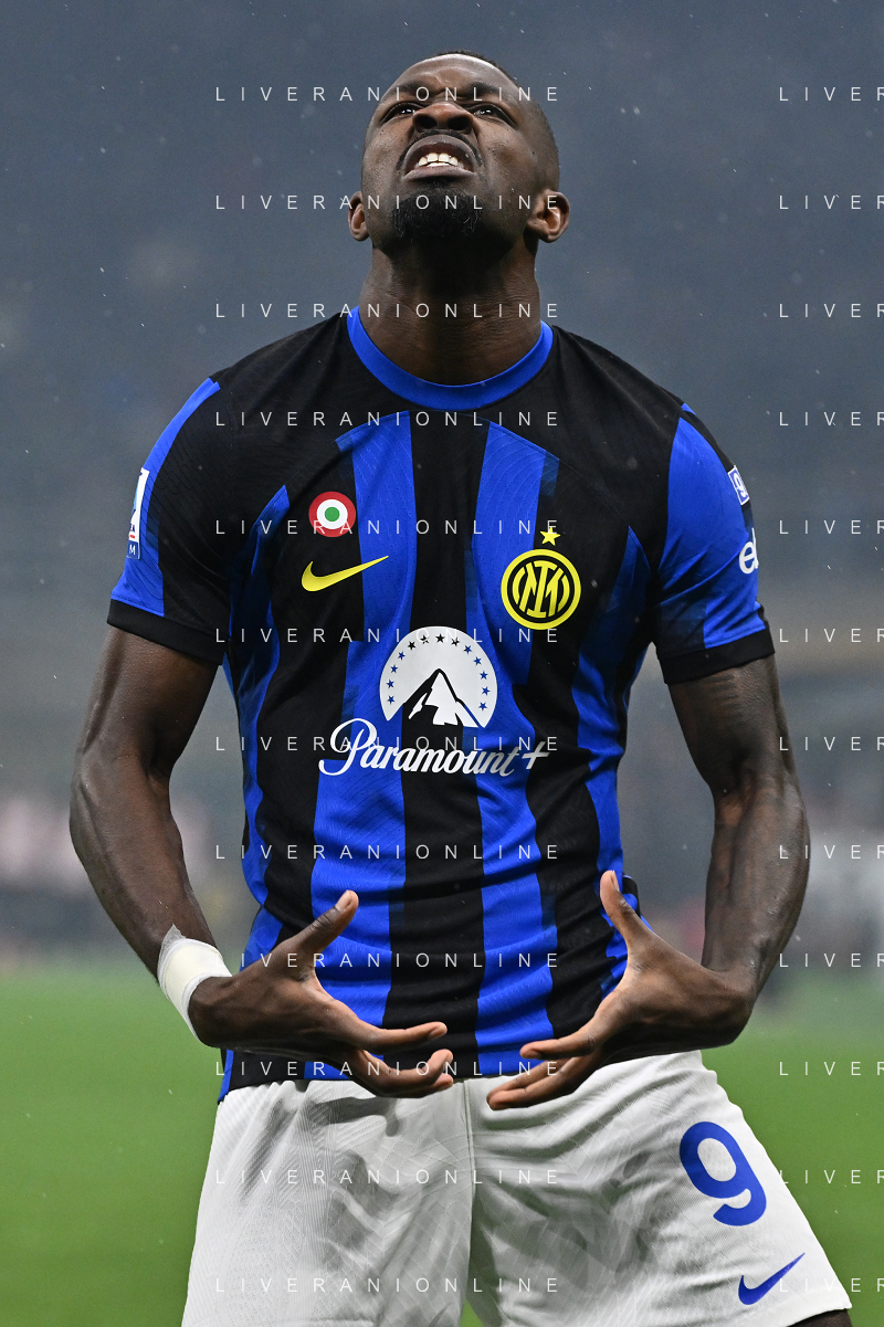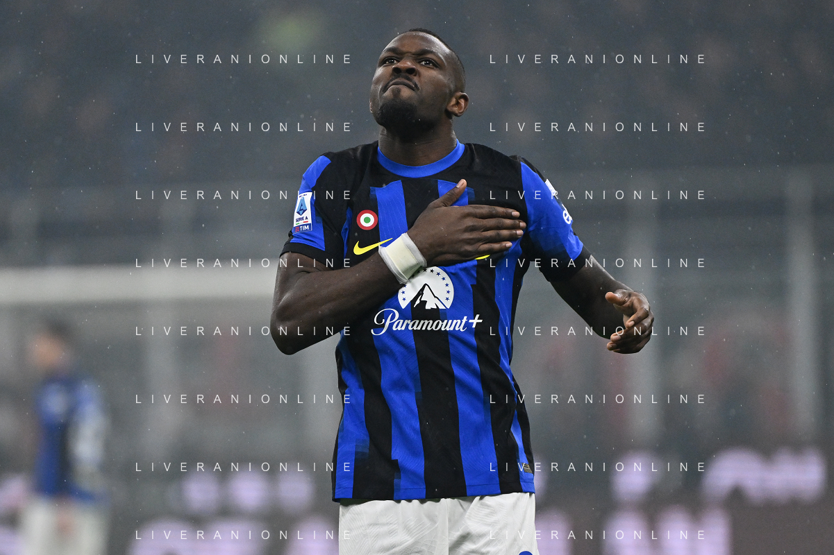 Milan vs Inter nella foto Marcus Thuram (Inter) esulta dopo il gol del 2 a 0 Milano 22-04-2024 Stadio Giuseppe Meazza - San Siro Campionato Serie A TIM - 33a giornata foto Roberto Garavaglia/Agenzia Aldo Liverani sas / AGENZIA ALDO LIVERANI SAS