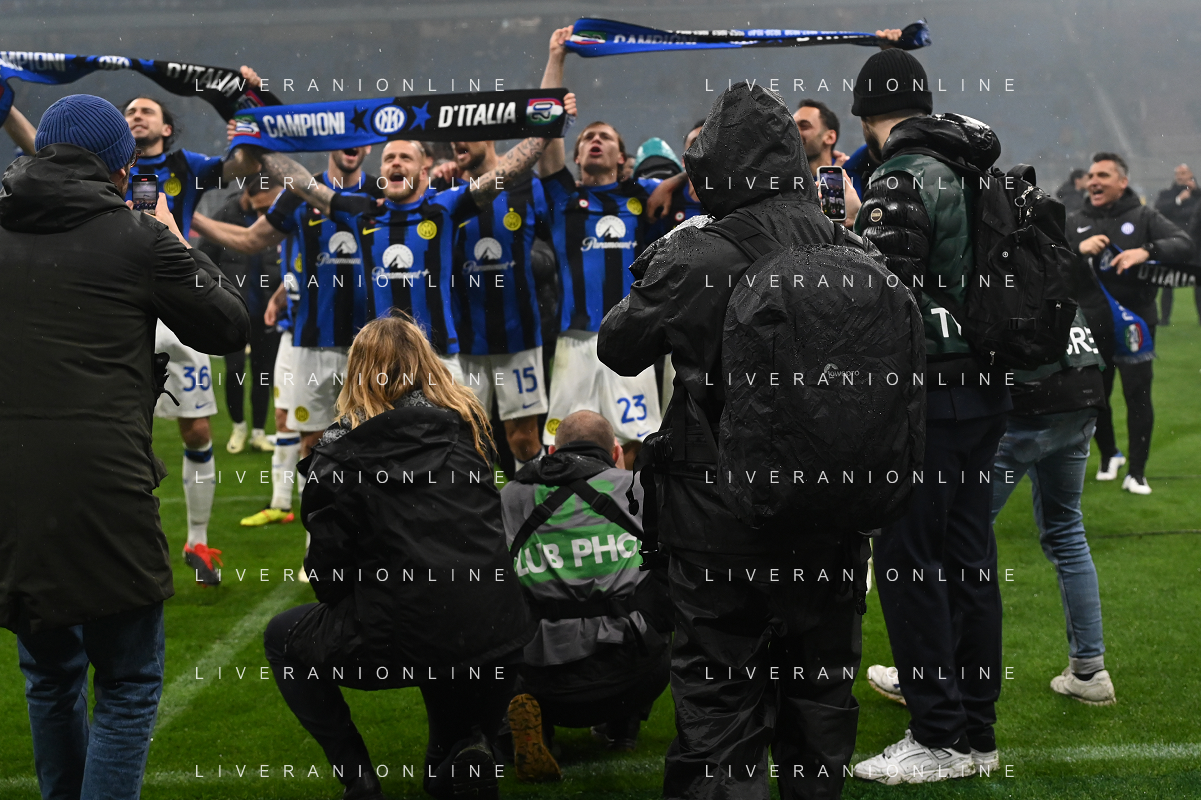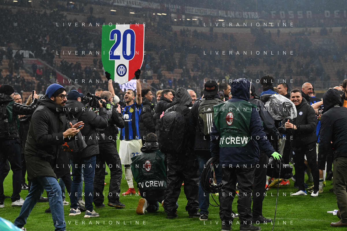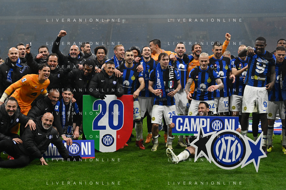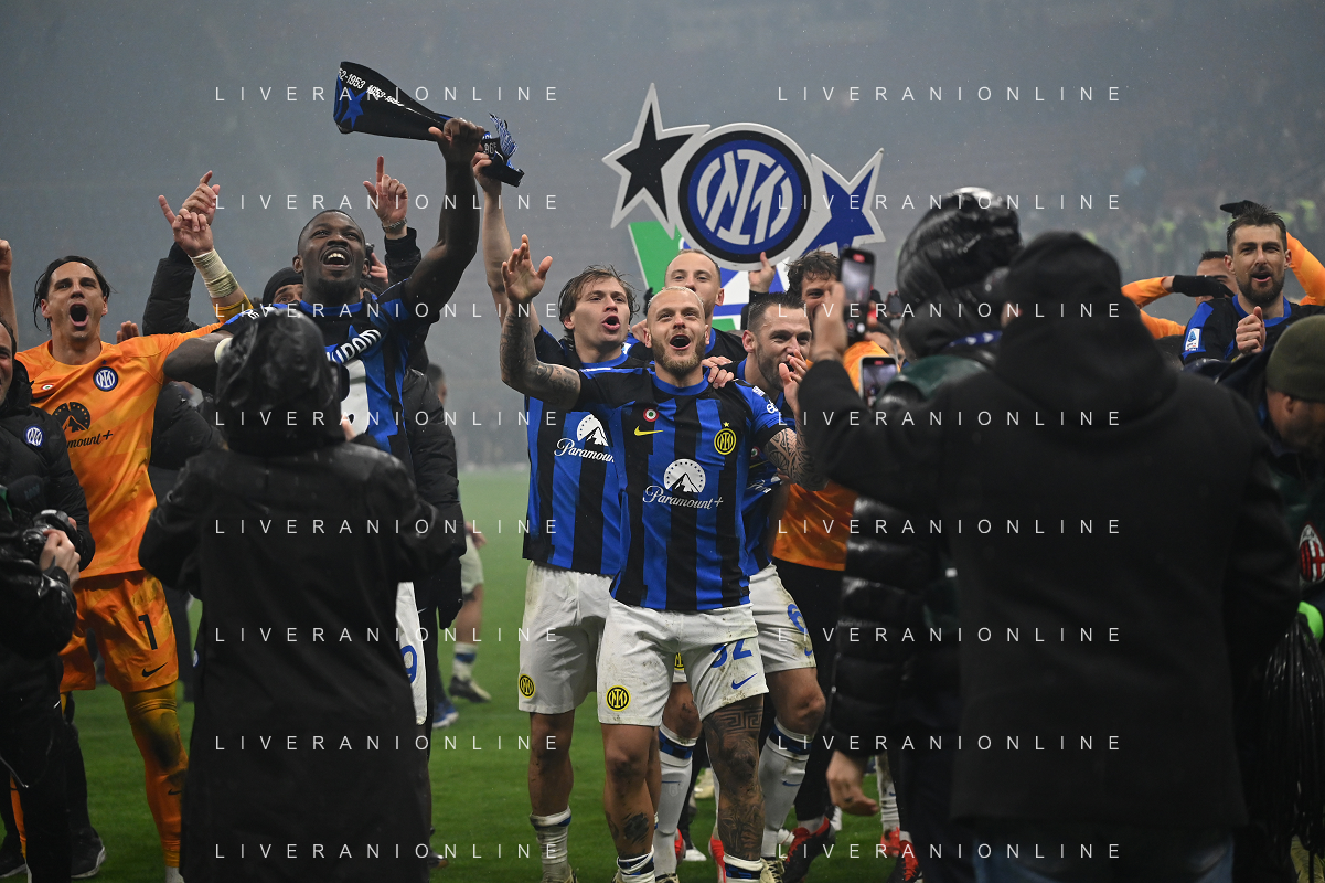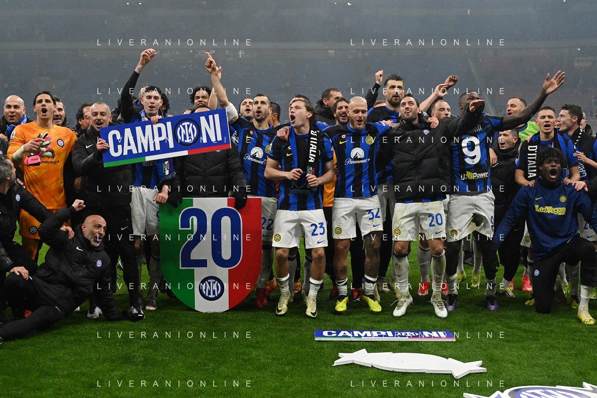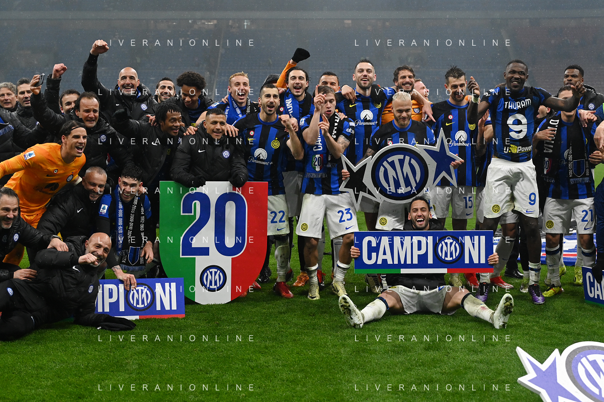 Milan vs Inter nella foto esultanza finale Inter - Festeggiamenti per la vittoria del 20mo scudetto Milano 22-04-2024 Stadio Giuseppe Meazza - San Siro Campionato Serie A TIM - 33a giornata foto Roberto Garavaglia/Agenzia Aldo Liverani sas / AGENZIA ALDO LIVERANI SAS