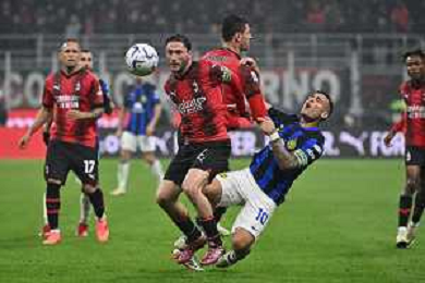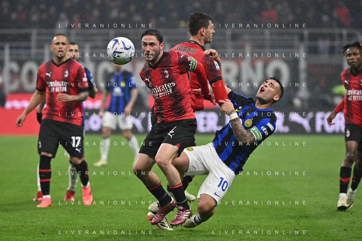 Milan vs Inter nella foto intervento di Matteo Gabbia (Milan) su Lautaro Martinez (Inter) Milano 22-04-2024 Stadio Giuseppe Meazza - San Siro Campionato Serie A TIM - 33a giornata foto Roberto Garavaglia/Agenzia Aldo Liverani sas / AGENZIA ALDO LIVERANI SAS