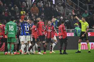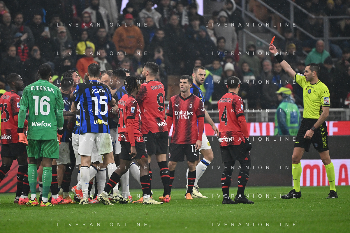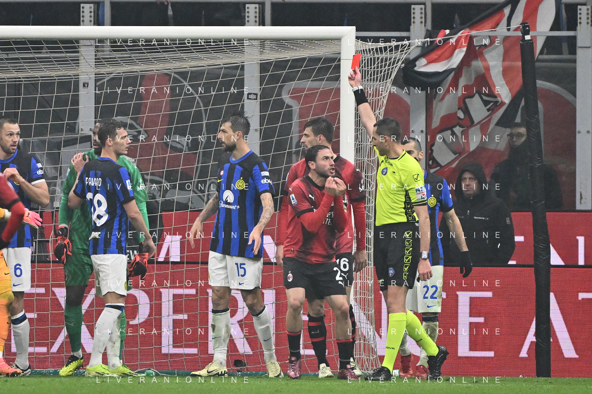 Milan vs Inter nella foto l'arbitro Andrea Colombo di Como espelle Davide Calabria (Milan) Milano 22-04-2024 Stadio Giuseppe Meazza - San Siro Campionato Serie A TIM - 33a giornata foto Roberto Garavaglia/Agenzia Aldo Liverani sas / AGENZIA ALDO LIVERANI SAS