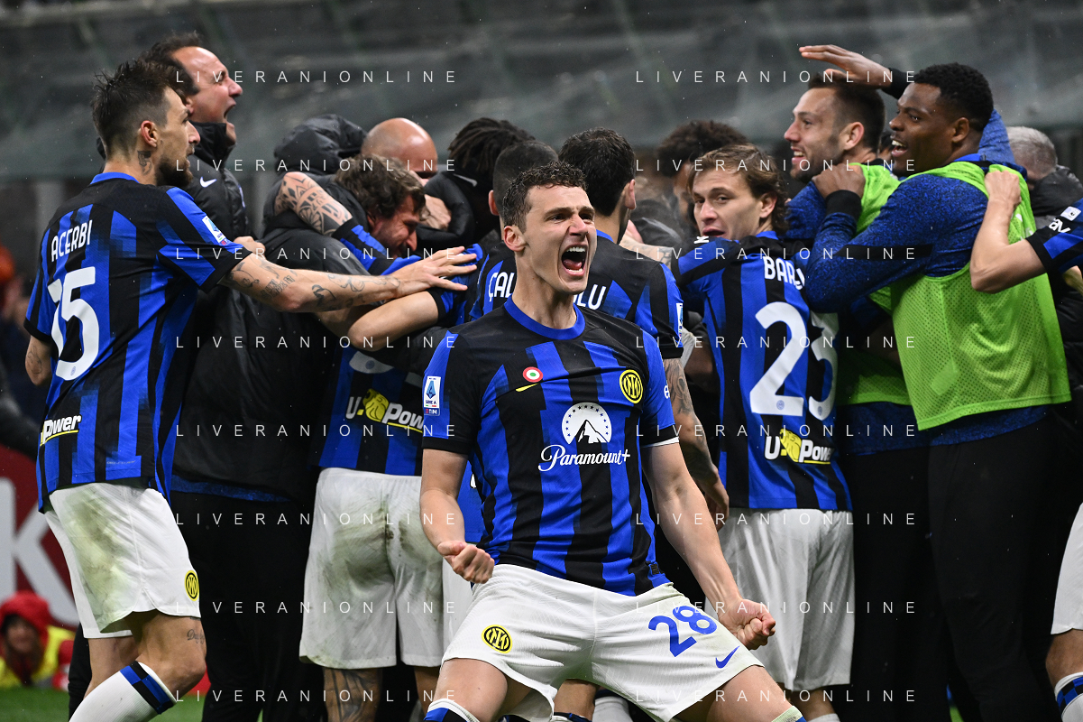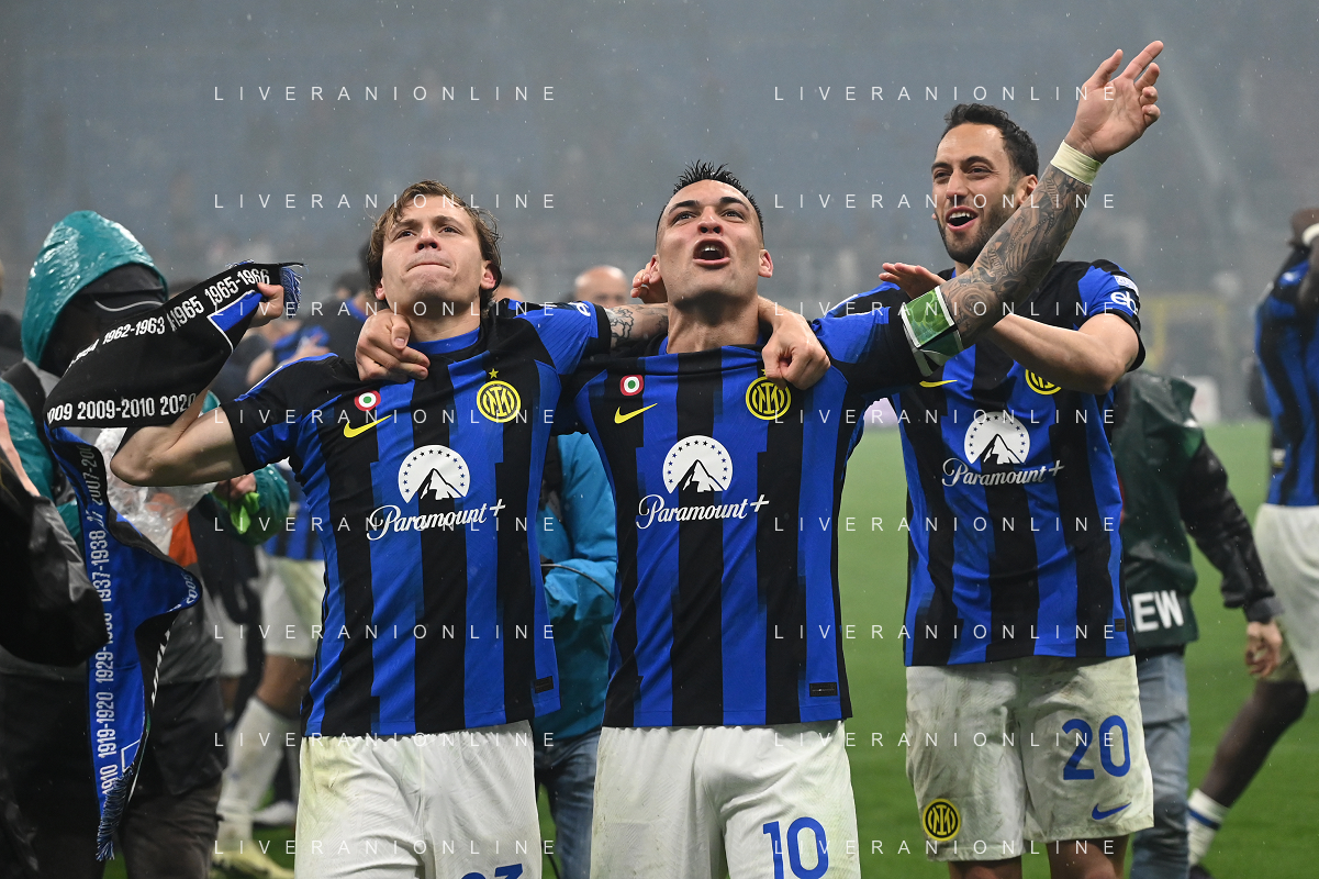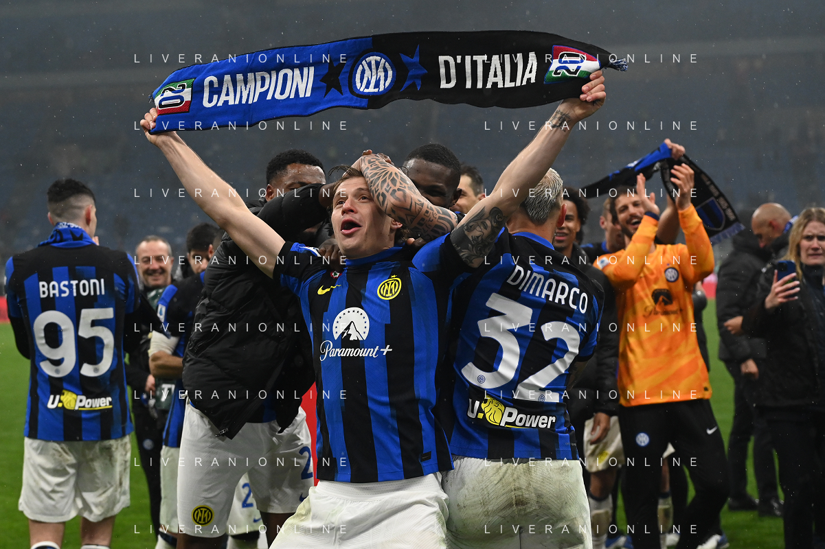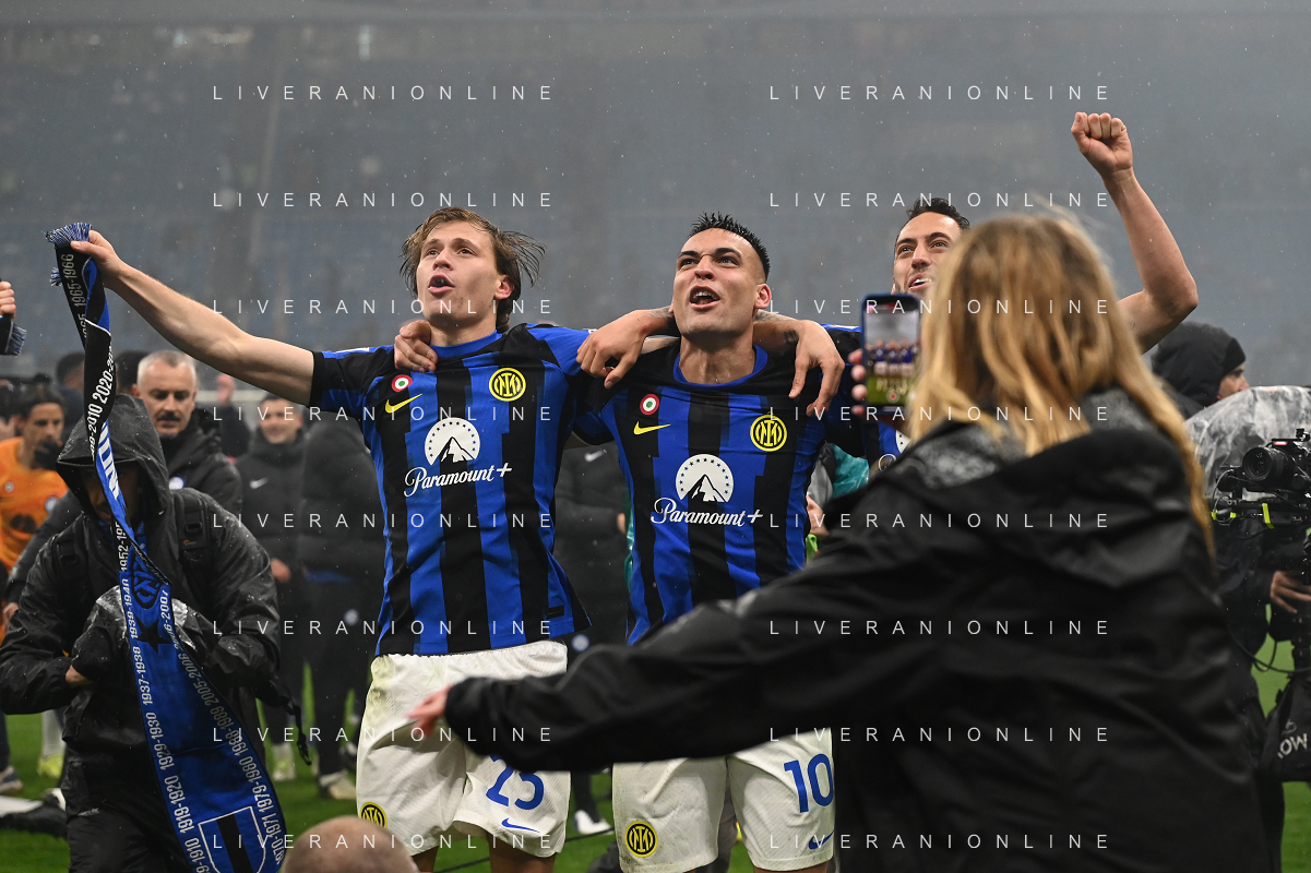 Milan vs Inter nella foto esultanza finale Inter - Festeggiamenti per la vittoria del 20mo scudetto - lautaro martinez e nicolo' barella Milano 22-04-2024 Stadio Giuseppe Meazza - San Siro Campionato Serie A TIM - 33a giornata foto Roberto Garavaglia/Agenzia Aldo Liverani sas / AGENZIA ALDO LIVERANI SAS