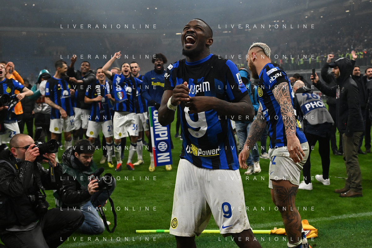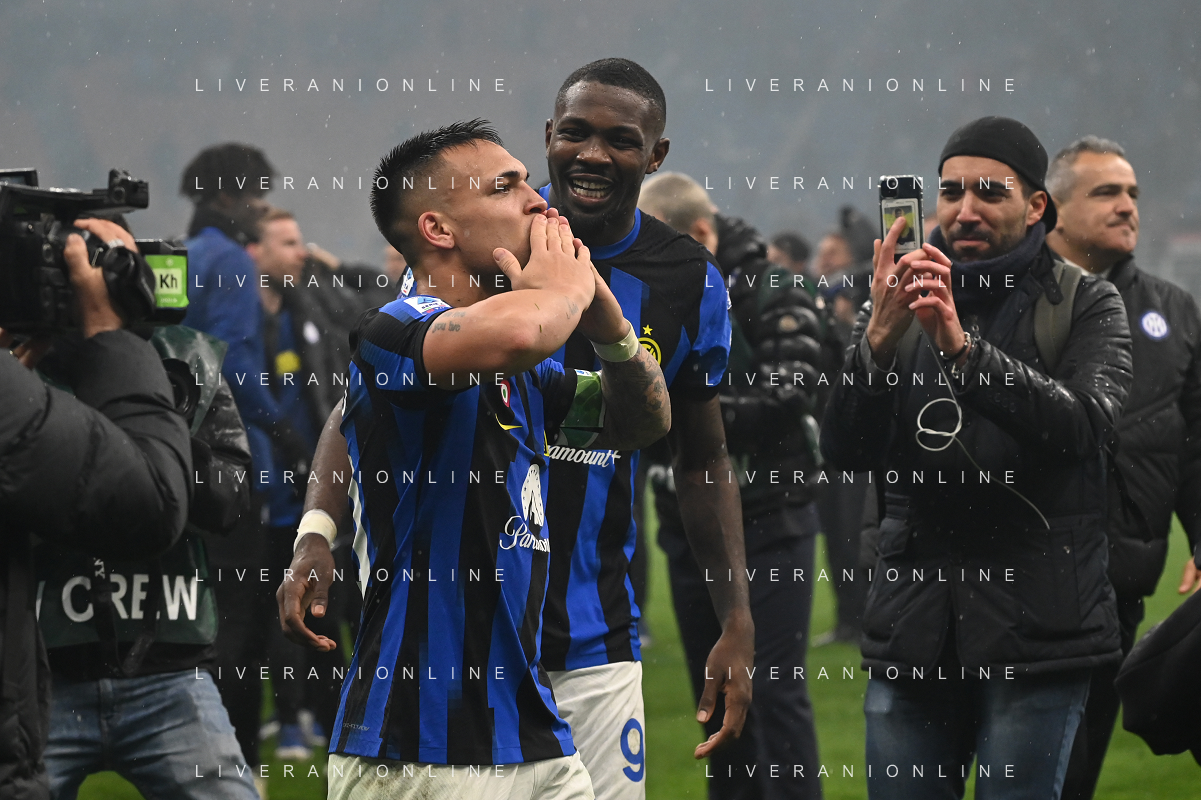Milan vs Inter nella foto esultanza finale Inter - Festeggiamenti per la vittoria del 20mo scudetto - lautaro martinez e marcus thuram Milano 22-04-2024 Stadio Giuseppe Meazza - San Siro Campionato Serie A TIM - 33a giornata foto Roberto Garavaglia/Agenzia Aldo Liverani sas / AGENZIA ALDO LIVERANI SAS