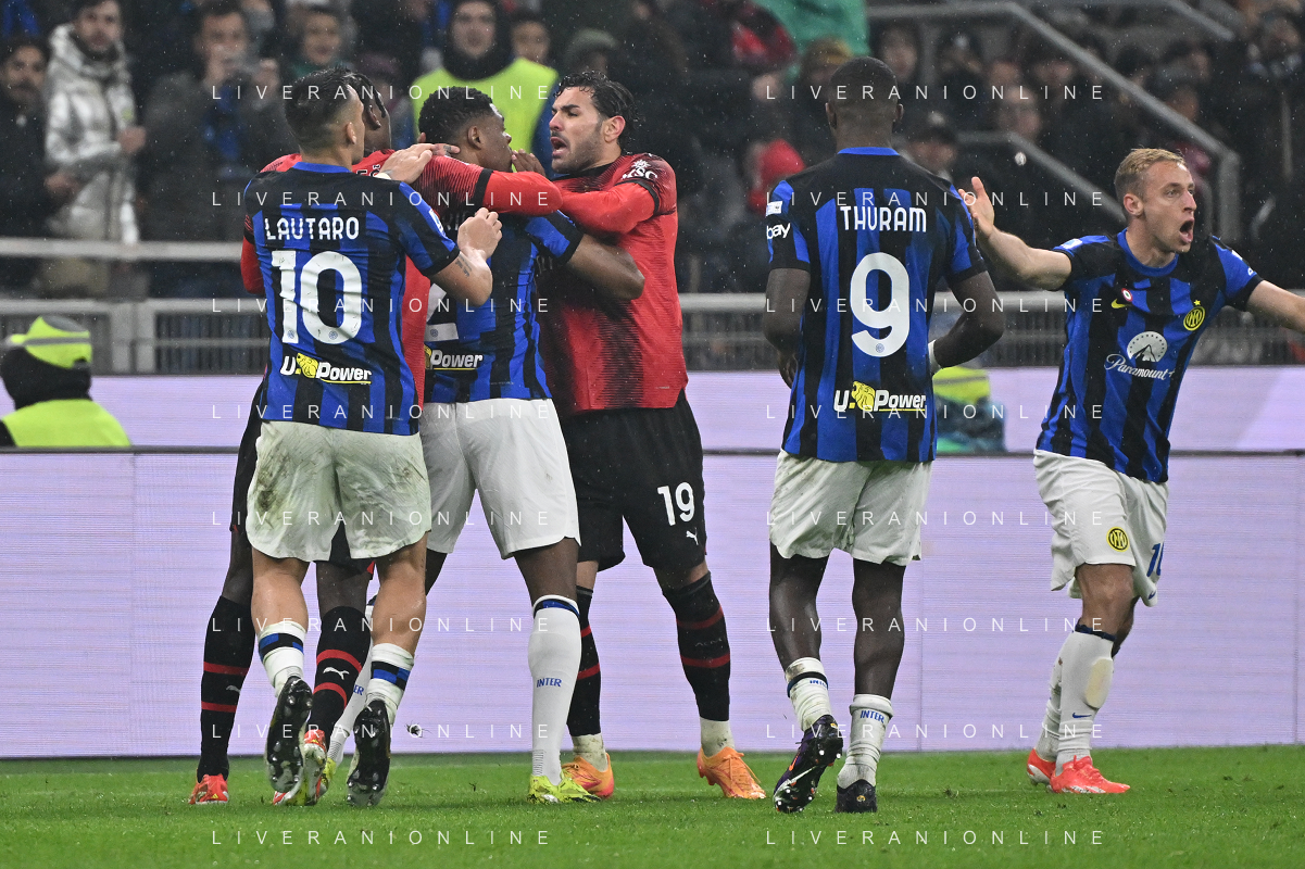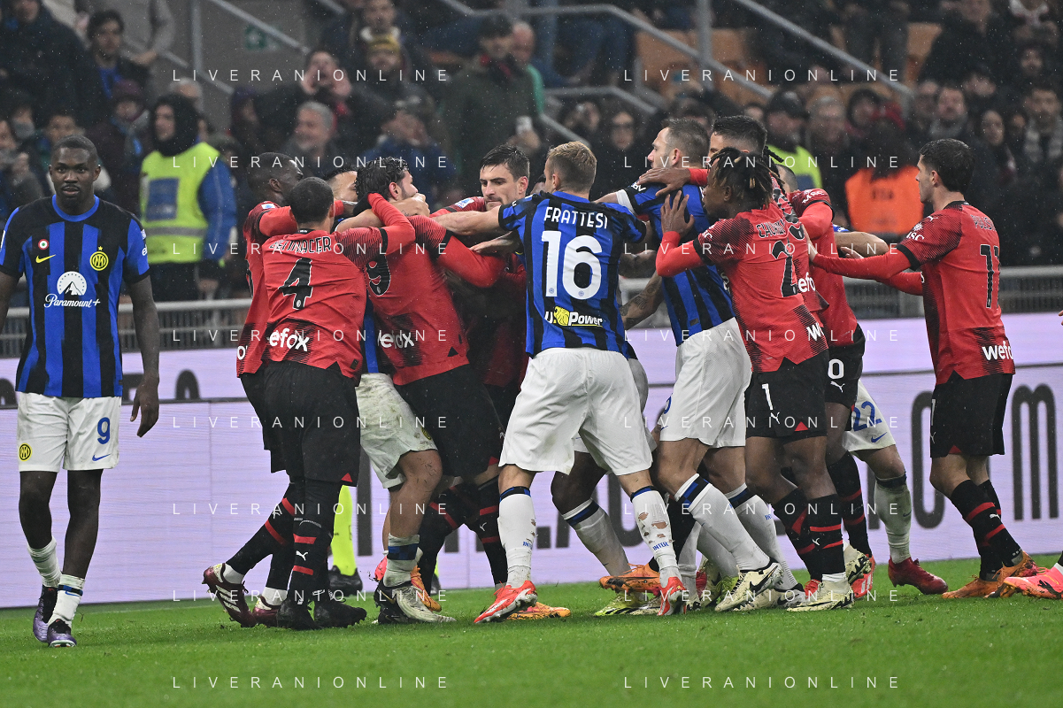 Milan vs Inter nella foto l'arbitro Andrea Colombo di Como espelle Theo Hernandez (Milan) e Denzel Dumfries (Inter) per la rissa nei minuti finali Milano 22-04-2024 Stadio Giuseppe Meazza - San Siro Campionato Serie A TIM - 33a giornata foto Roberto Garavaglia/Agenzia Aldo Liverani sas / AGENZIA ALDO LIVERANI SAS