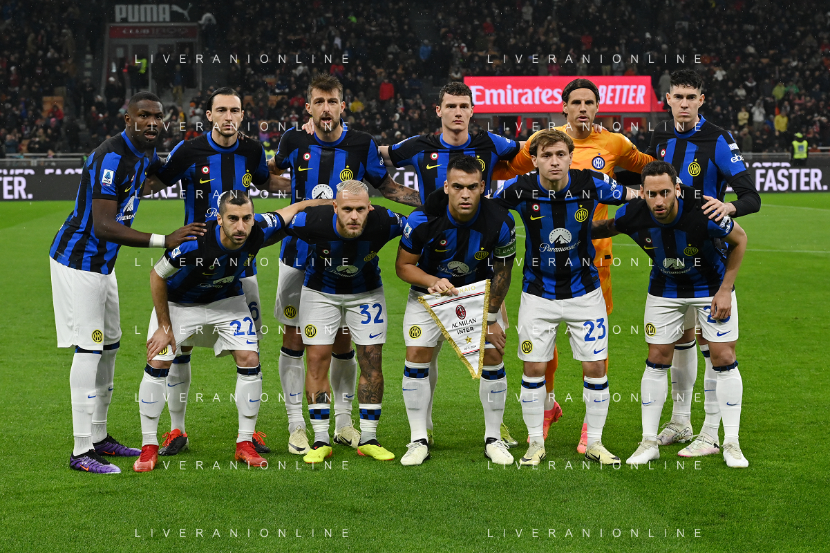 Milan vs Inter nella foto formazione Inter, in piedi da SX Marcus Thuram, Matteo Darmian, Francesco Acerbi, Benjamin Pavard, Yann Sommer e Alessandro Bastoni; in basso da SX Henrikh Mkhitaryan, Federico Dimarco, Lautaro Martinez, Nicolo' Barella e Hakan Calhanoglu Milano 22-04-2024 Stadio Giuseppe Meazza - San Siro Campionato Serie A TIM - 33a giornata foto Roberto Garavaglia/Agenzia Aldo Liverani sas / AGENZIA ALDO LIVERANI SAS