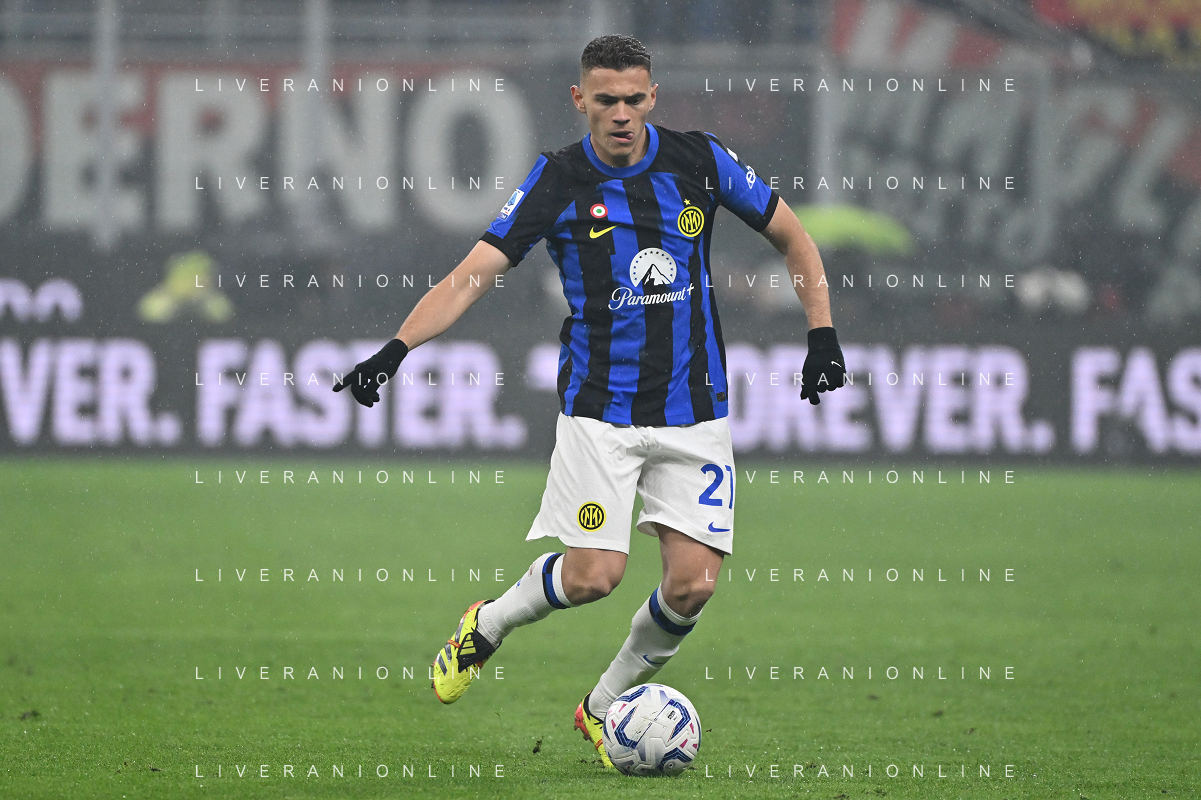 Milan vs Inter nella foto Kristjan Asllani (Inter) Milano 22-04-2024 Stadio Giuseppe Meazza - San Siro Campionato Serie A TIM - 33a giornata foto Roberto Garavaglia/Agenzia Aldo Liverani sas / AGENZIA ALDO LIVERANI SAS