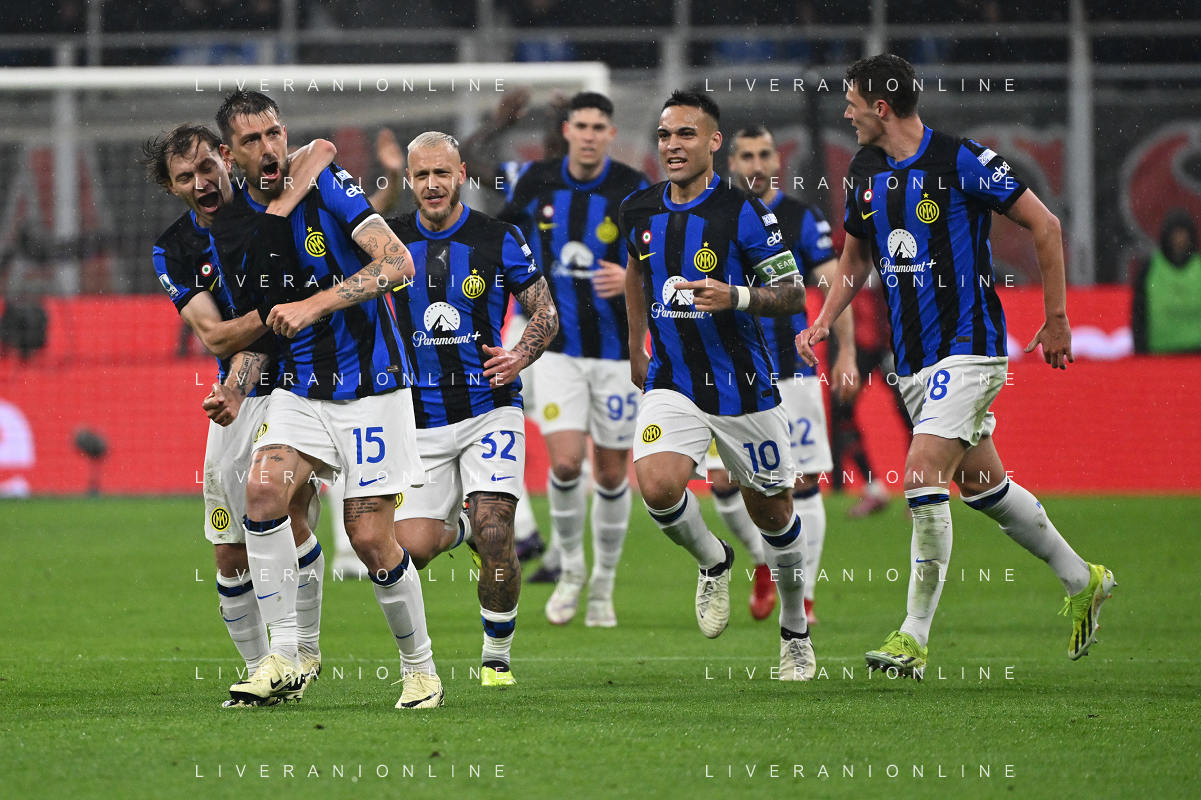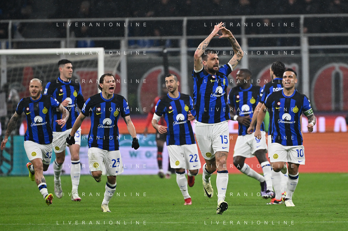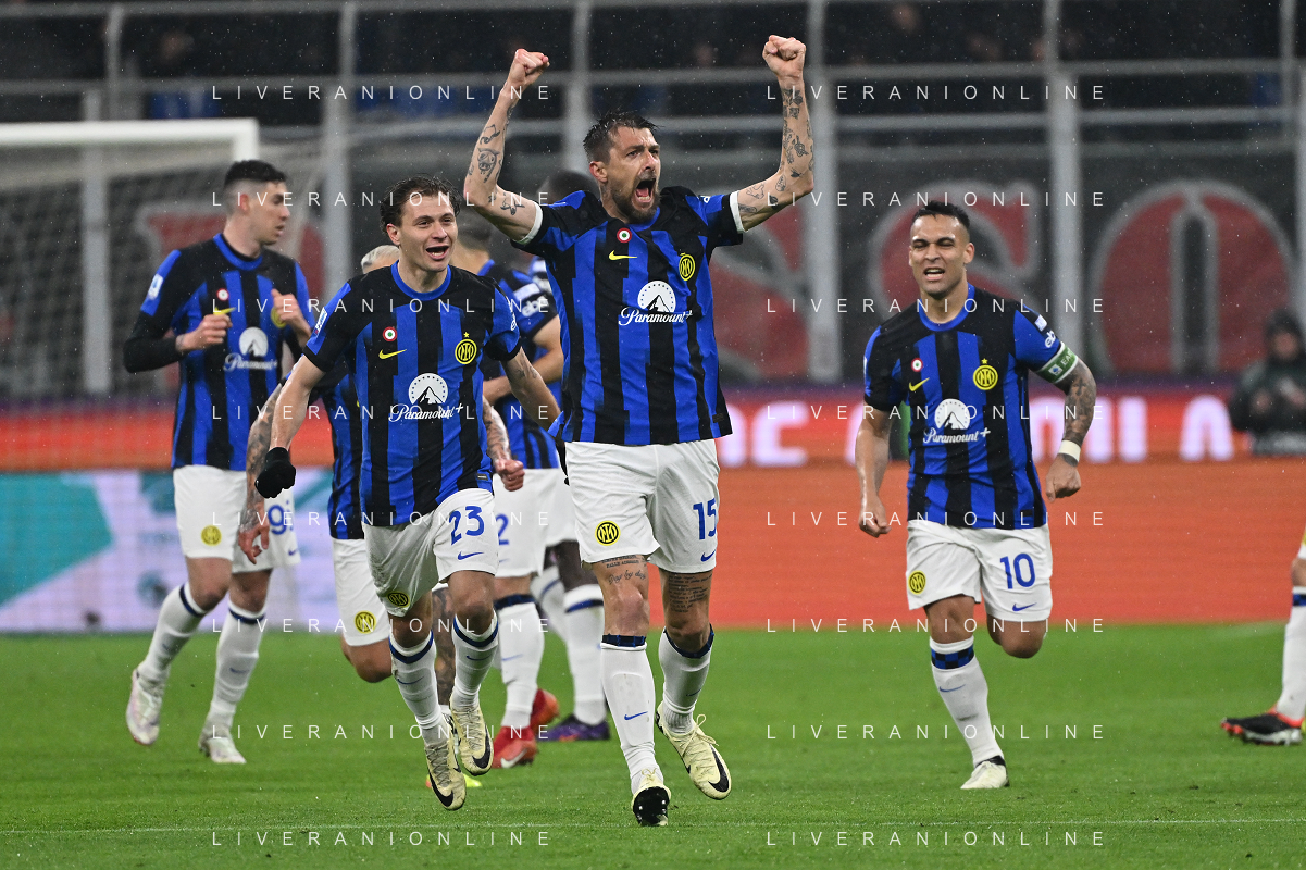 Milan vs Inter nella foto esultanza Inter dopo il gol dell'1 a 0 Francesco Acerbi Milano 22-04-2024 Stadio Giuseppe Meazza - San Siro Campionato Serie A TIM - 33a giornata foto Roberto Garavaglia/Agenzia Aldo Liverani sas / AGENZIA ALDO LIVERANI SAS