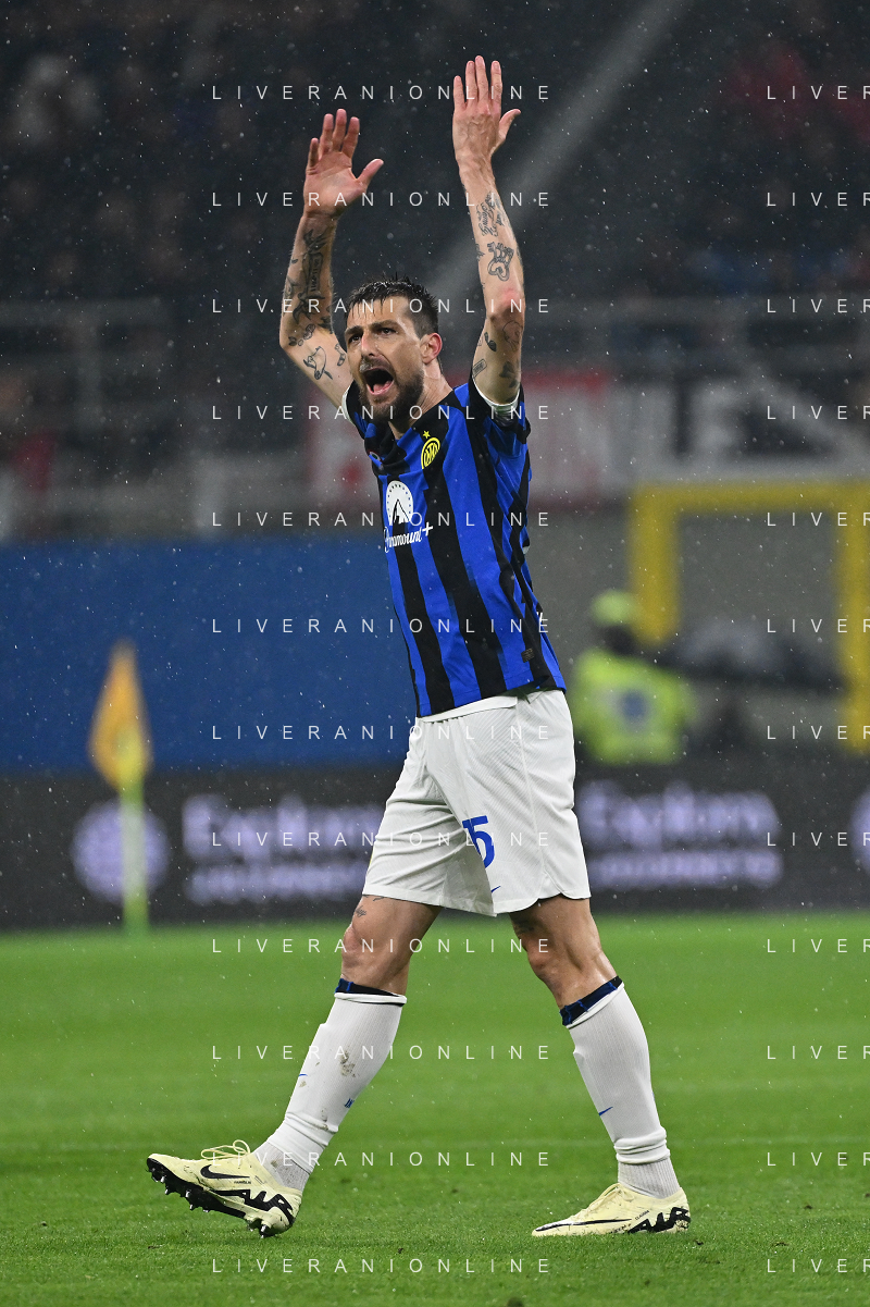 Milan vs Inter nella foto Francesco Acerbi (Inter) esulta dopo il gol dell'1 a 0 Milano 22-04-2024 Stadio Giuseppe Meazza - San Siro Campionato Serie A TIM - 33a giornata foto Roberto Garavaglia/Agenzia Aldo Liverani sas / AGENZIA ALDO LIVERANI SAS