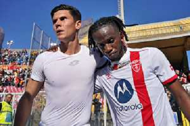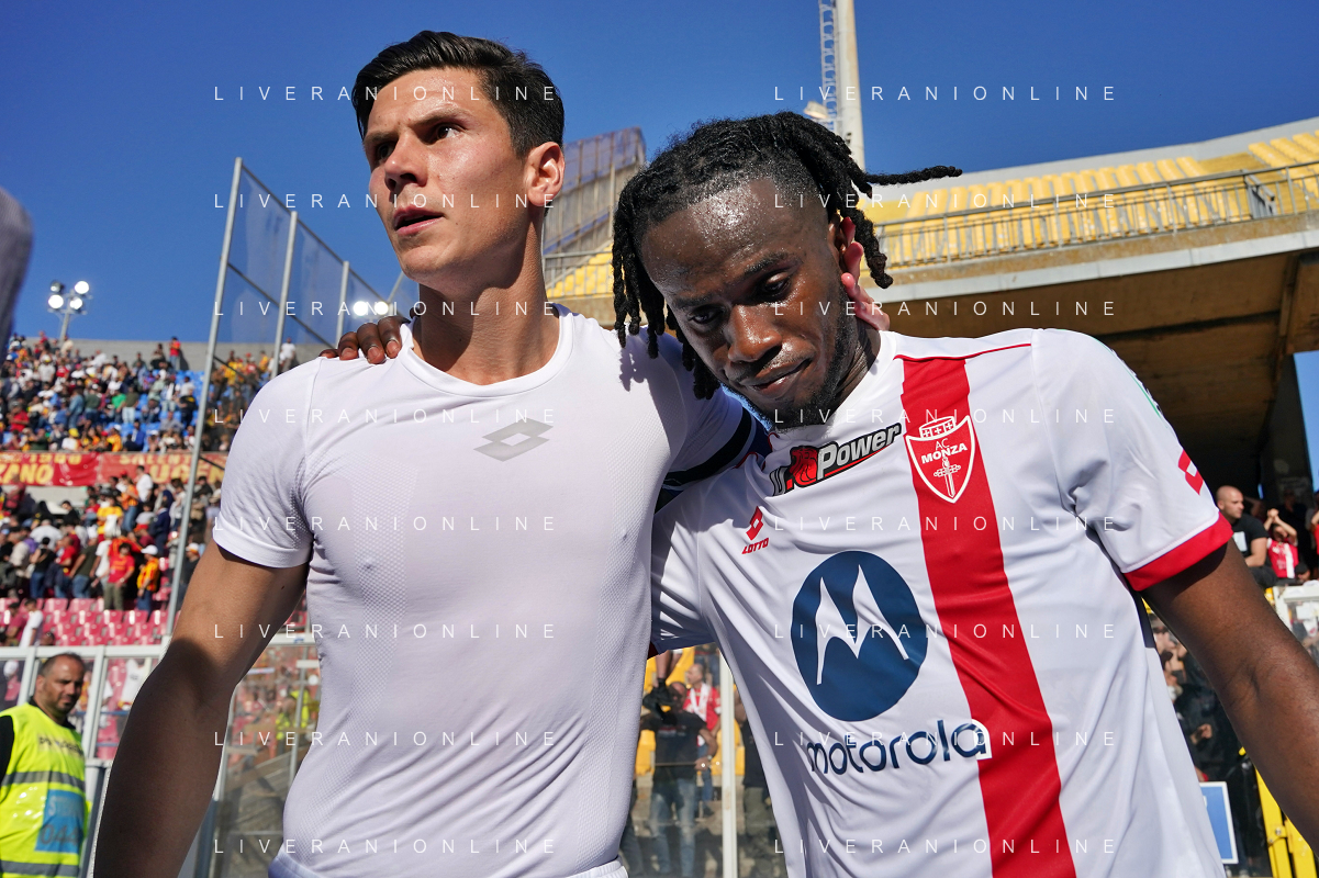 TVEM Matteo Pessina of AC Monza and Warren Bondo of AC Monza during the Italian soccer Serie A match US Lecce vs Monza on April 27, 2024 at Via del Mare Stadium in Lecce, Italy. Photo Emmanuele Mastrodonato/agenzia Liverani/ AGENZIA ALDO LIVERANI SAS