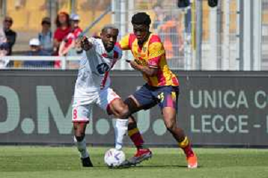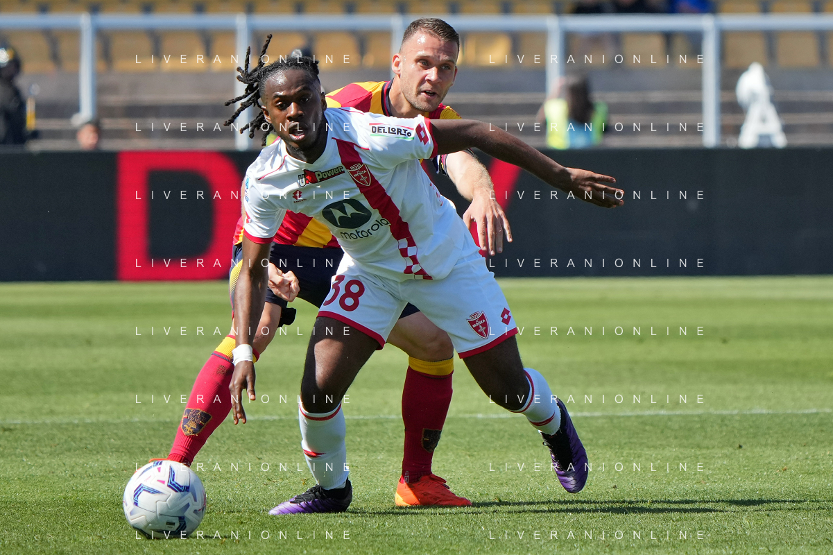 TVEM Jean-Daniel Akpa-Akpro of AC Monza in action against Patrick Dorgu of US Lecce during the Italian soccer Serie A match US Lecce vs Monza on April 27, 2024 at Via del Mare Stadium in Lecce, Italy. Photo Emmanuele Mastrodonato/agenzia Liverani/ AGENZIA ALDO LIVERANI SAS