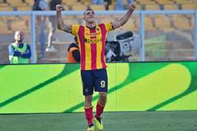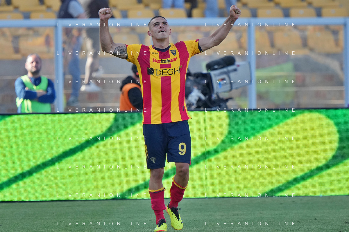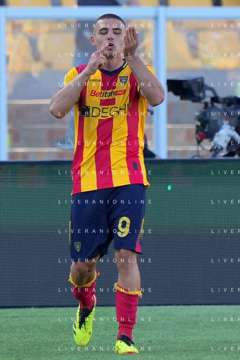 TVEM Nikola Krstovic of US Lecce celebrates after scoring a goal during the Italian soccer Serie A match US Lecce vs Monza on April 27, 2024 at Via del Mare Stadium in Lecce, Italy. Photo Emmanuele Mastrodonato/agenzia Liverani