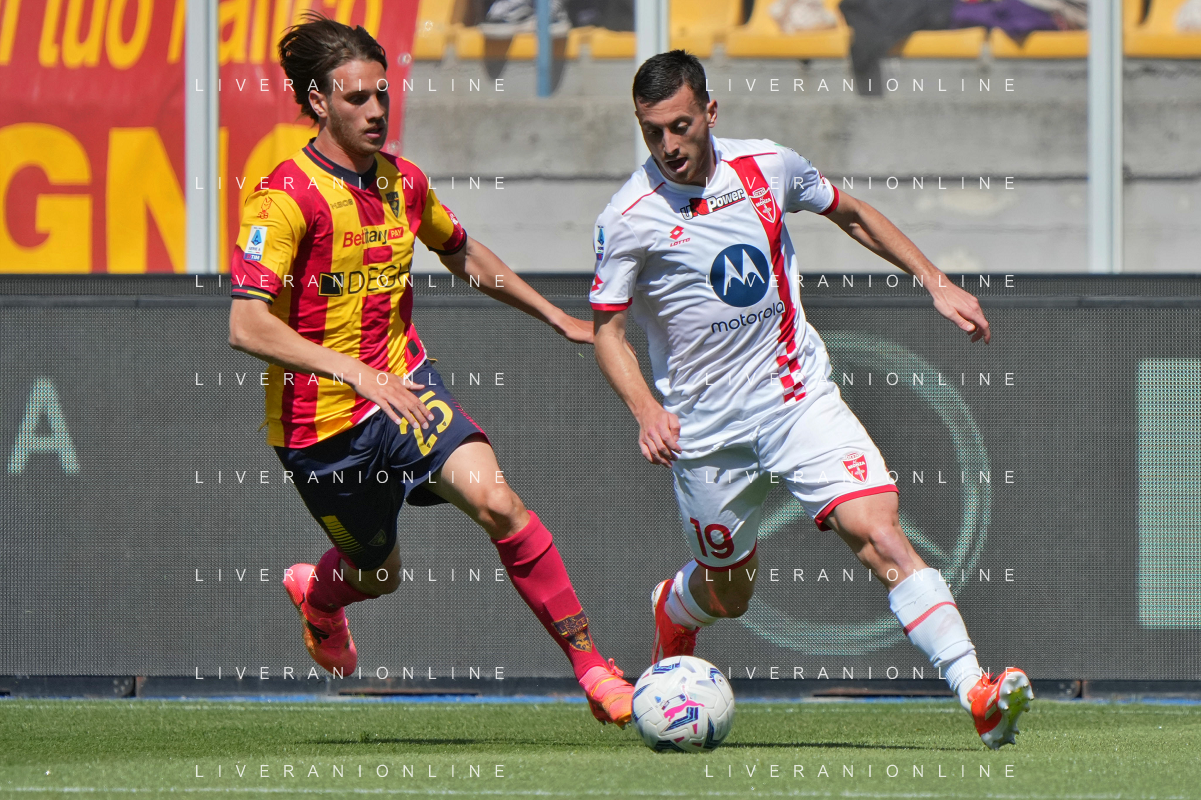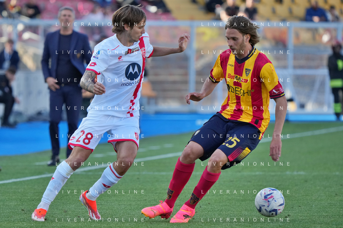 TVEM Andrea Colpani of AC Monza in action against Antonino Gallo of US Lecce during the Italian soccer Serie A match US Lecce vs Monza on April 27, 2024 at Via del Mare Stadium in Lecce, Italy. Photo Emmanuele Mastrodonato/agenzia Liverani