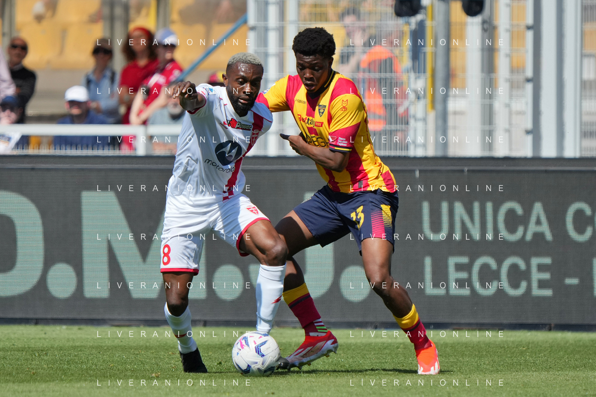TVEM Jean-Daniel Akpa-Akpro of AC Monza in action against Santiago Pierotti of US Lecce during the Italian soccer Serie A match US Lecce vs Monza on April 27, 2024 at Via del Mare Stadium in Lecce, Italy. Photo Emmanuele Mastrodonato/agenzia Liverani