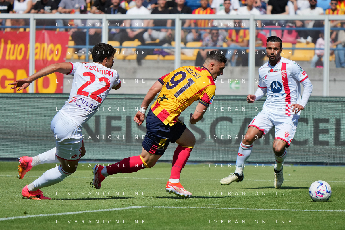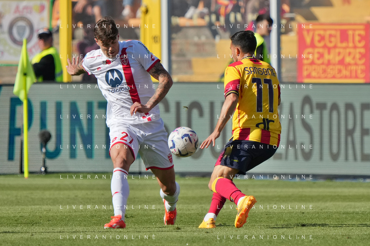 TVEM Daniel Maldini of AC Monza in action against Nicola Sansone of US Lecce during the Italian soccer Serie A match US Lecce vs Monza on April 27, 2024 at Via del Mare Stadium in Lecce, Italy. Photo Emmanuele Mastrodonato/agenzia Liverani
