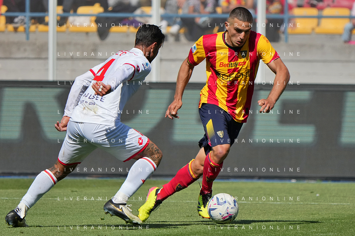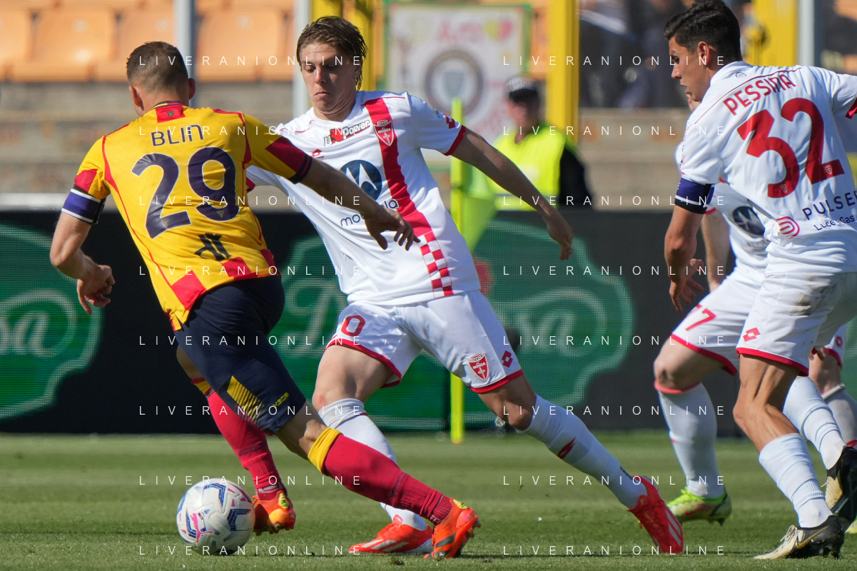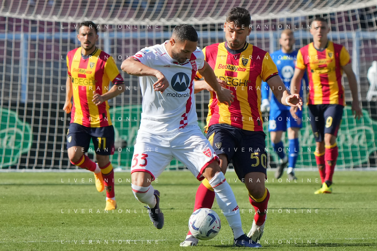 TVEM Alexis Blin of US Lecce in action against Alessio Zerbin of AC Monza during the Italian soccer Serie A match US Lecce vs Monza on April 27, 2024 at Via del Mare Stadium in Lecce, Italy. Photo Emmanuele Mastrodonato/agenzia Liverani