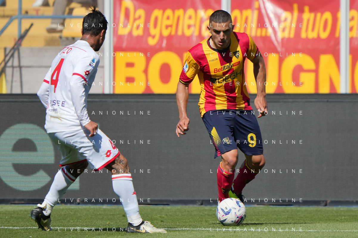 TVEM Marin Pongracic of US Lecce in action against Lorenzo Colombo of AC Monza during the Italian soccer Serie A match US Lecce vs Monza on April 27, 2024 at Via del Mare Stadium in Lecce, Italy. Photo Emmanuele Mastrodonato/agenzia Liverani