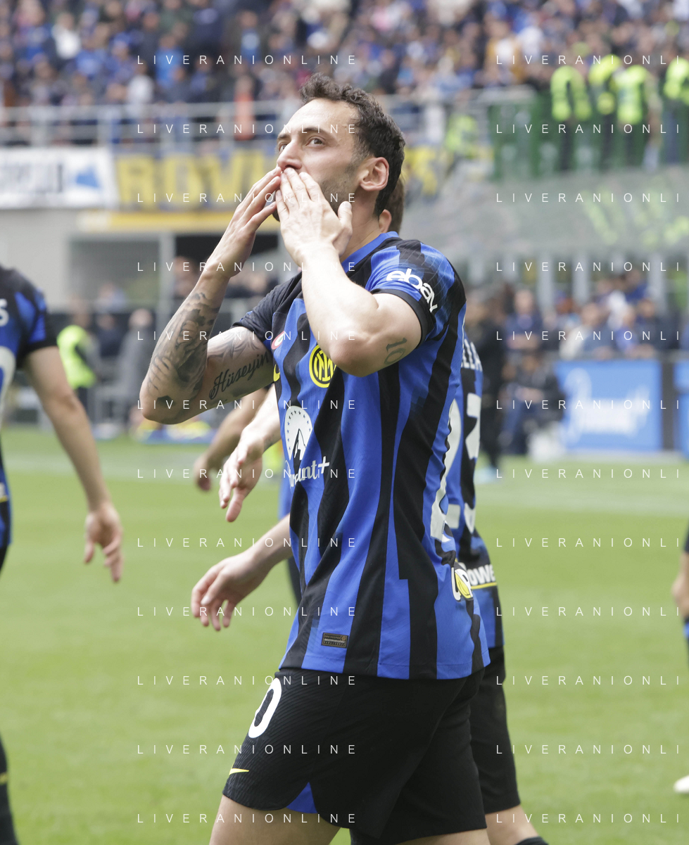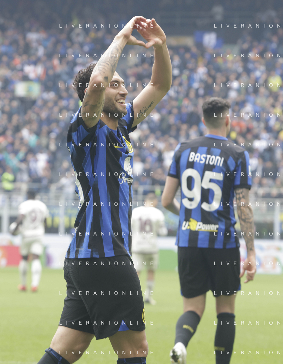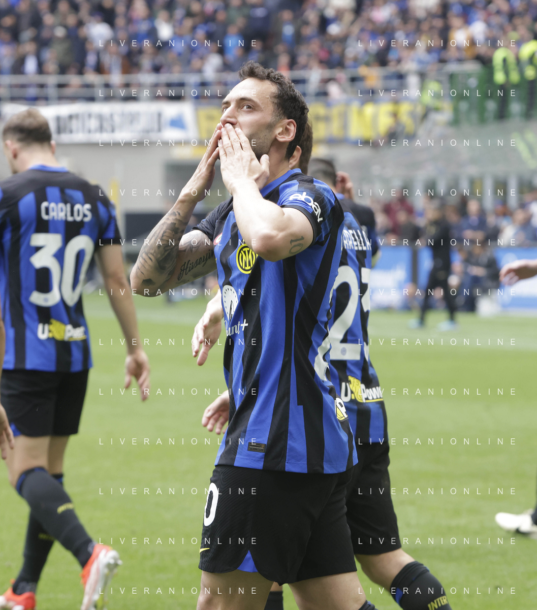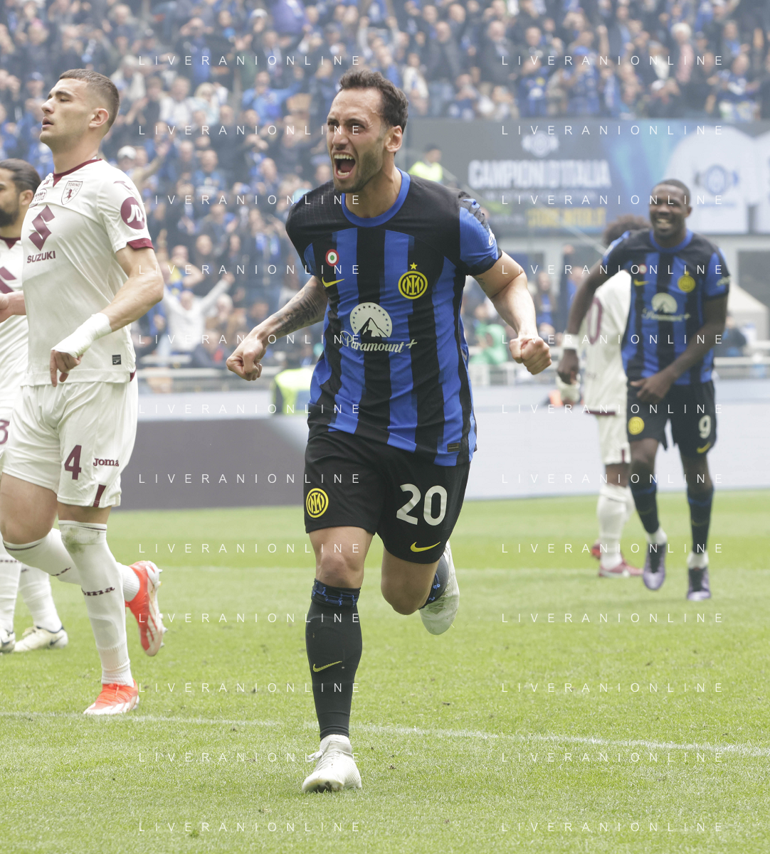 Inter vs Torino nella foto Hakan Çalhanoglu (Inter) esulta dopo il gol del 2 a 0 Milano 28-04-2024 Stadio Giuseppe Meazza - San Siro Campionato Serie A TIM - 34a giornata foto Tiziano Ballabio/Agenzia Aldo Liverani sas / AGENZIA ALDO LIVERANI SAS / AGENZIA ALDO LIVERANI SAS