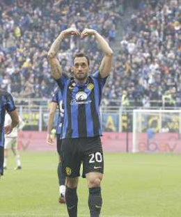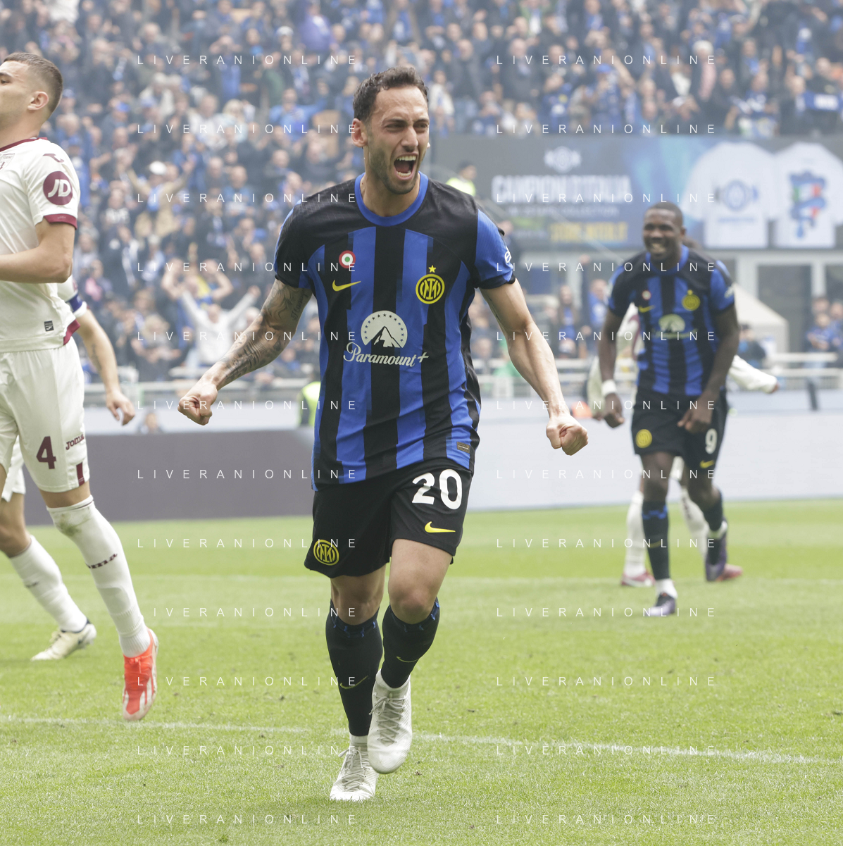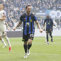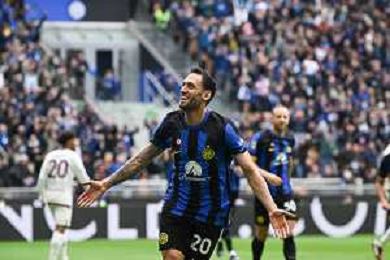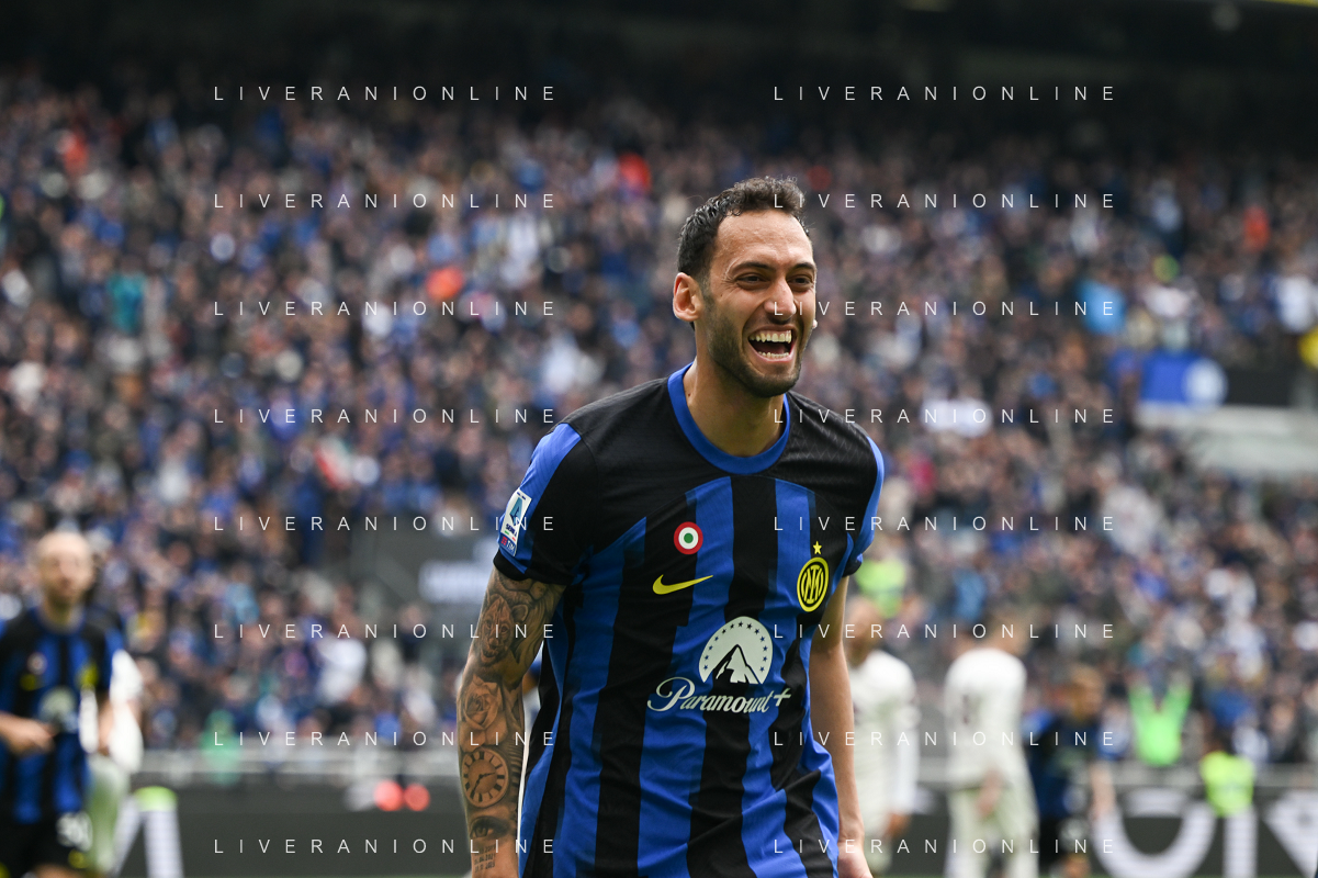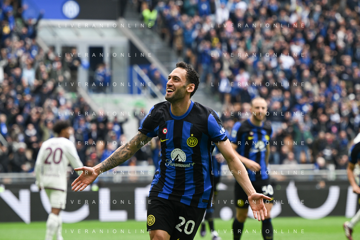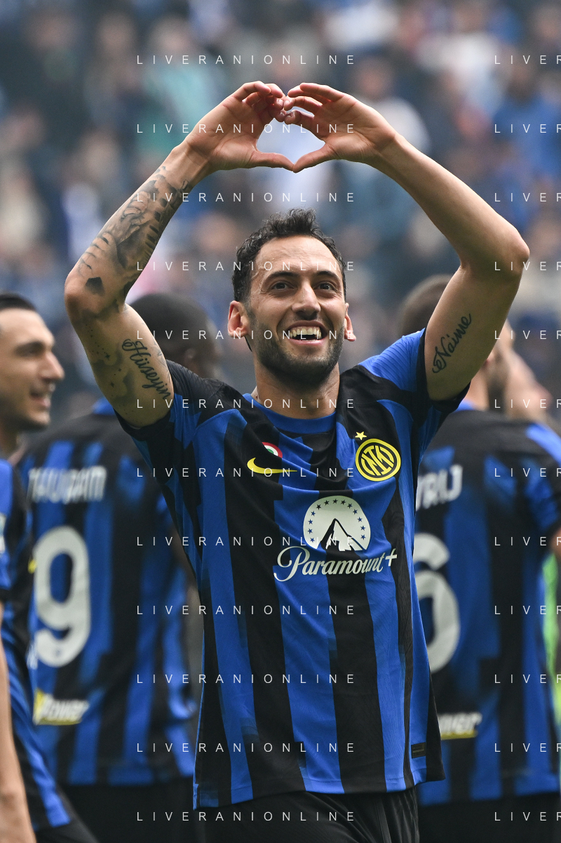 Inter vs Torino nella foto Hakan Çalhanoglu (Inter) esulta dopo il gol del 2 a 0 Milano 28-04-2024 Stadio Giuseppe Meazza - San Siro Campionato Serie A TIM - 34a giornata foto Tiziano Ballabio/Agenzia Aldo Liverani sas / AGENZIA ALDO LIVERANI SAS / AGENZIA ALDO LIVERANI SAS