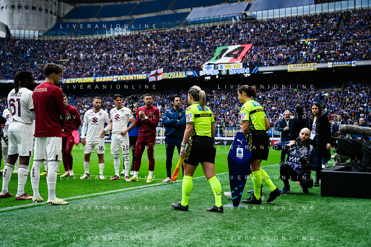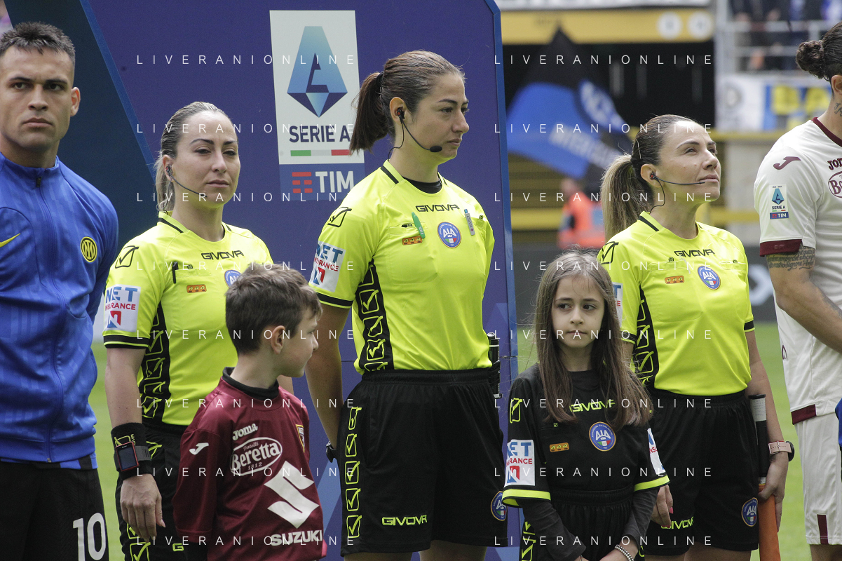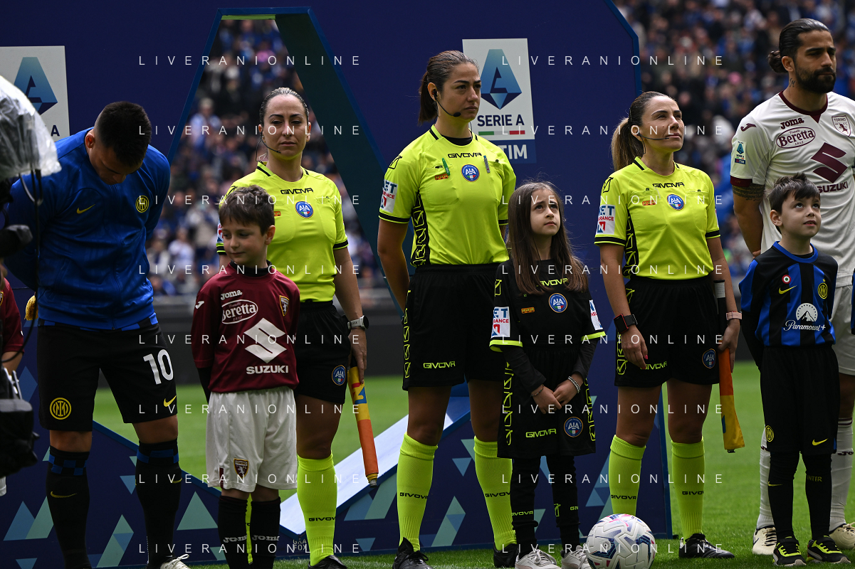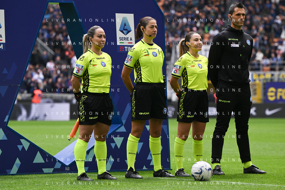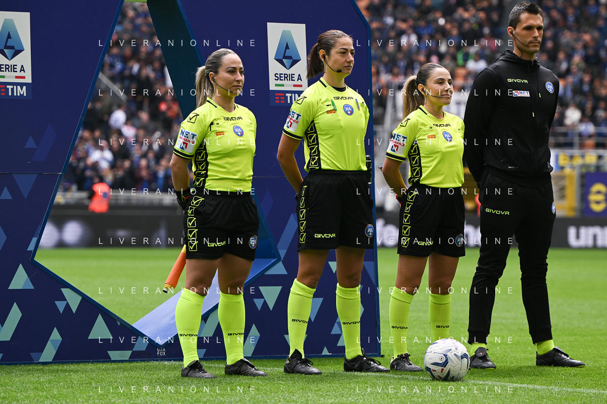Inter vs Torino nella foto Maria Sole Ferrieri Caputi, arbitro del match, affiancata dalle assistenti Francesca Di Monte e Tiziana Trasciatti prima della partita a Milano 28-04-2024 Stadio Giuseppe Meazza - San Siro Campionato Serie A TIM - 34a giornata foto Tiziano Ballabio/Agenzia Aldo Liverani sas / AGENZIA ALDO LIVERANI SAS / AGENZIA ALDO LIVERANI SAS