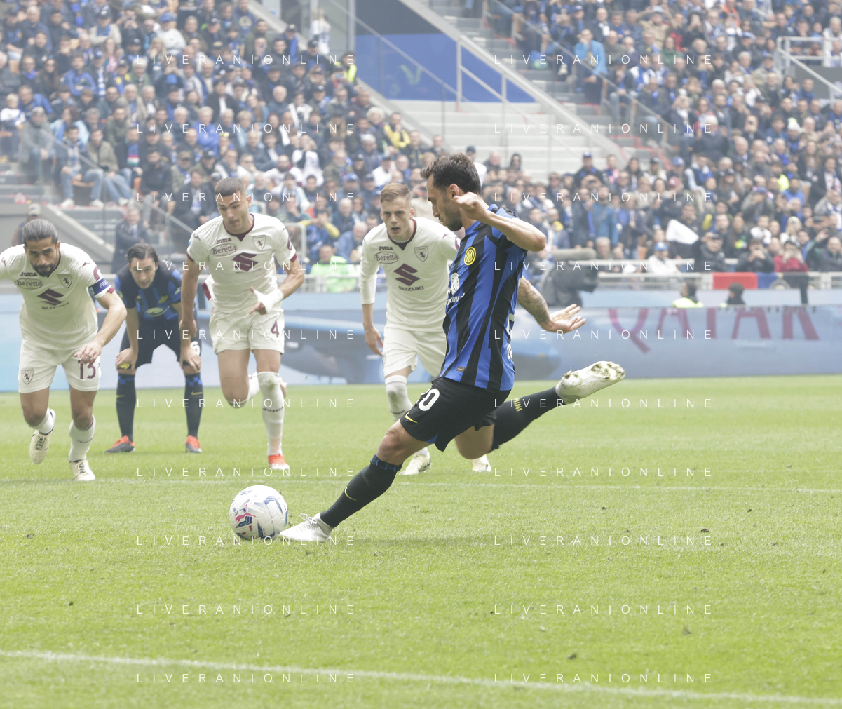 Inter vs Torino nella foto Hakan Çalhanoglu (Inter) realizza il rigore del 2 - 0 Milano 28-04-2024 Stadio Giuseppe Meazza - San Siro Campionato Serie A TIM - 34a giornata foto Tiziano Ballabio/Agenzia Aldo Liverani sas / AGENZIA ALDO LIVERANI SAS / AGENZIA ALDO LIVERANI SAS