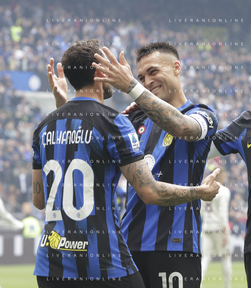 Inter vs Torino nella foto Hakan Çalhanoglu (Inter) esulta dopo il gol del 2 a 0 assiema al capitano lautaro Martinez (Inter) Milano 28-04-2024 Stadio Giuseppe Meazza - San Siro Campionato Serie A TIM - 34a giornata foto Tiziano Ballabio/Agenzia Aldo Liverani sas / AGENZIA ALDO LIVERANI SAS / AGENZIA ALDO LIVERANI SAS
