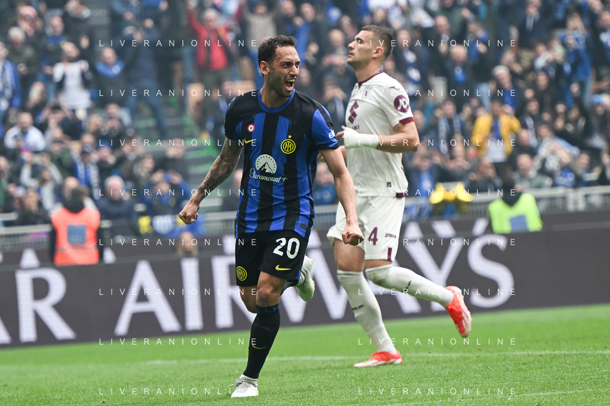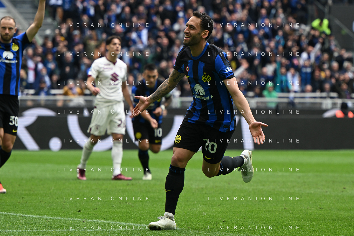 Inter vs Torino nella foto Hakan Çalhanoglu (Inter) esulta dopo il gol del 1 a 0 Milano 28-04-2024 Stadio Giuseppe Meazza - San Siro Campionato Serie A TIM - 34a giornata foto Tiziano Ballabio/Agenzia Aldo Liverani sas / AGENZIA ALDO LIVERANI SAS / AGENZIA ALDO LIVERANI SAS