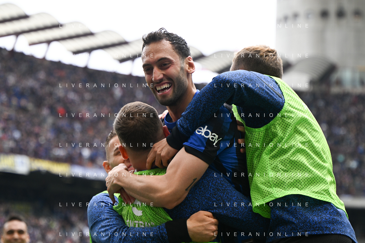 Inter vs Torino nella foto Hakan Çalhanoglu (Inter) esulta con i compagni dopo il gol del 1 a 0 Milano 28-04-2024 Stadio Giuseppe Meazza - San Siro Campionato Serie A TIM - 34a giornata foto Tiziano Ballabio/Agenzia Aldo Liverani sas / AGENZIA ALDO LIVERANI SAS / AGENZIA ALDO LIVERANI SAS