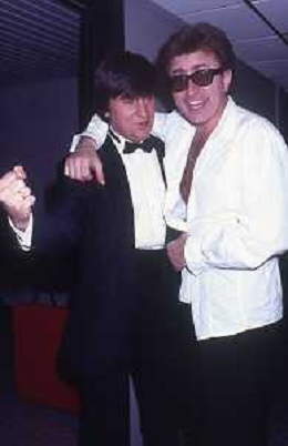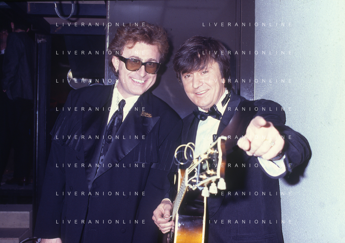 DIAP-RETROSPETTIVA RED RONNIE PSEUDONIMO GABRIELE ANSALONI-CRITICO MUSICALE GIORNATISTA PRESENTATORE TELEVISIVO E CONDUTTORE RADIOFONICO NELLA FOTO RED RONNIE NELL'ANNO 1990 A MILANO CON BOBBY SOLO AG ALDO LIVERANI SAS