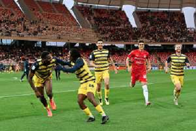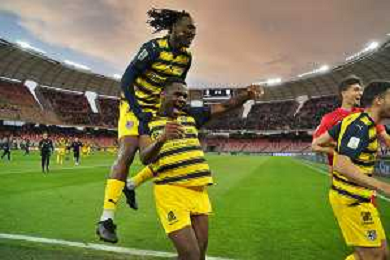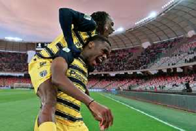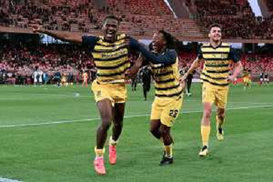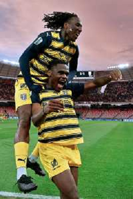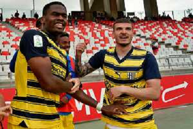 Ange-Yoan Bonny of Parma Calcio and Woyo Coulibaly of Parma Calcio celebrates the victory during the Italian Serie B match SSC Bari vs Parma on May 01, 2024 at the San Nicola stadium in Bari, Italy. Photo by Emmanuele Mastrodonato/agenzia Aldo Liverani sas/ AGENZIA ALDO LIVERANI SAS