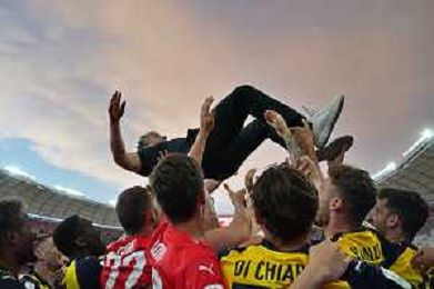 TVEM Gianluca Di Chiara of Parma Calcio are celebrating their mathematical promotion to Serie A at the end of the Serie B match on the SSC Bari field in Bari, Italy, on May 1, 2024. Photo by Emmanuele Mastrodonato/agenzia Aldo Liverani sas / AGENZIA ALDO LIVERANI SAS