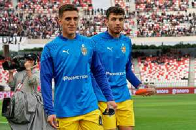 Valentin Mihaila of Parma Calcio and Dennis Man of Parma Calcio celebrates the victory during the Italian Serie B match SSC Bari vs Parma on May 01, 2024 at the San Nicola stadium in Bari, Italy. Photo by Emmanuele Mastrodonato/agenzia Aldo Liverani sas/ AGENZIA ALDO LIVERANI SAS