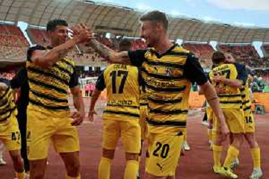 Ange-Yoan Bonny of Parma Calcio and Valentin Mihaila of Parma Calcio celebrates the victory during the Italian Serie B match SSC Bari vs Parma on May 01, 2024 at the San Nicola stadium in Bari, Italy. Photo by Emmanuele Mastrodonato/agenzia Aldo Liverani sas/ AGENZIA ALDO LIVERANI SAS