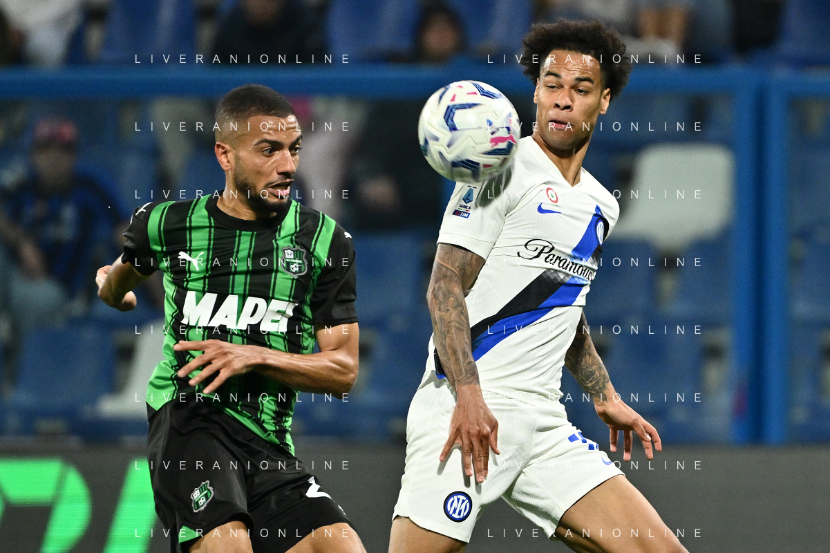 Sassuolo vs Inter nella foto Jeremy Toljan (Sassuolo) e Tajon Trevor Buchanan (Inter) Reggio Emilia 04-05-2024 Mapei Stadium - Stadio Città del Tricolore Campionato Serie A TIM - 35a giornata foto Roberto Garavaglia/Agenzia Aldo Liverani sas/ AGENZIA ALDO LIVERANI SAS