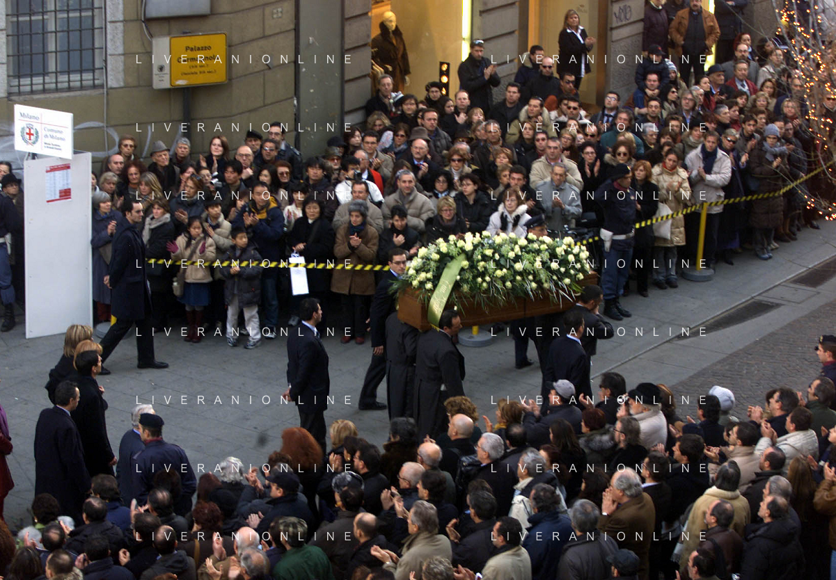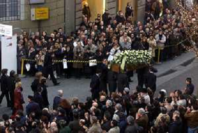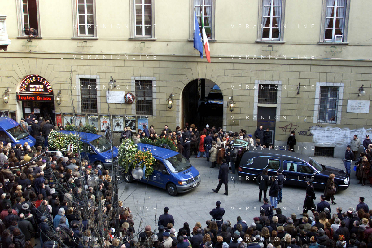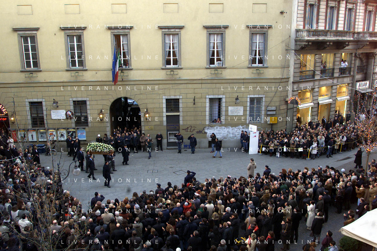 milano 03/01/03 piccolo teatro di via rovello dove è stata allestita la camera ardente per la morte di giorgio gaber nella foto il corteo funebre passa attraverso la folla foto mario romano/ag. aldo liverani