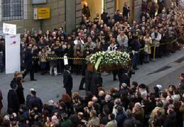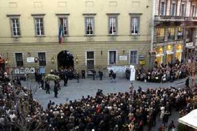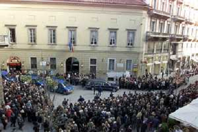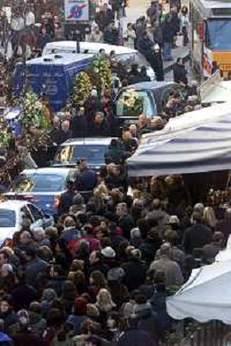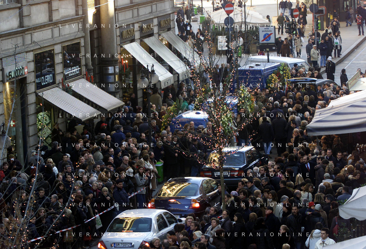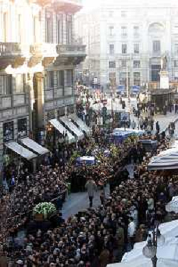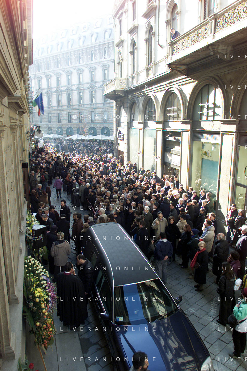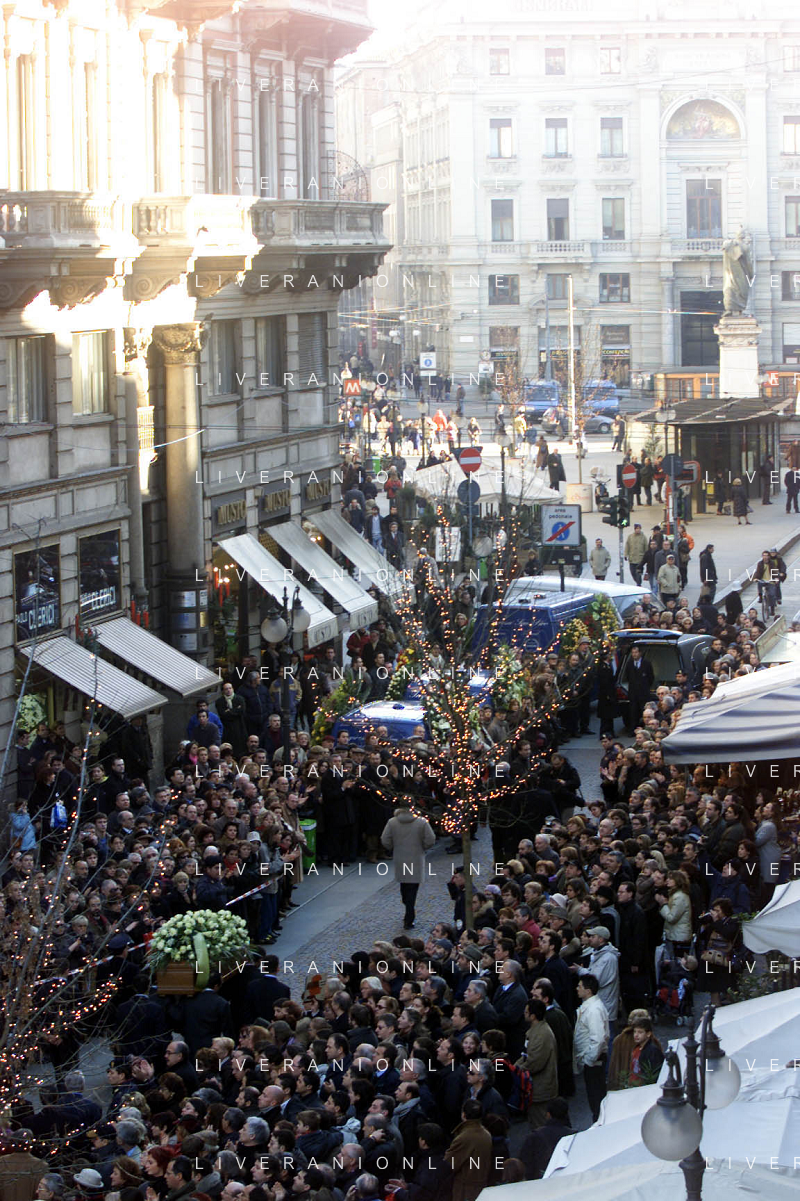 milano 03/01/03 piccolo teatro di via rovello dove è stata allestita la camera ardente per la morte di giorgio gaber nella foto il corteo funebre passa attraverso la folla foto mario romano/ag. aldo liverani